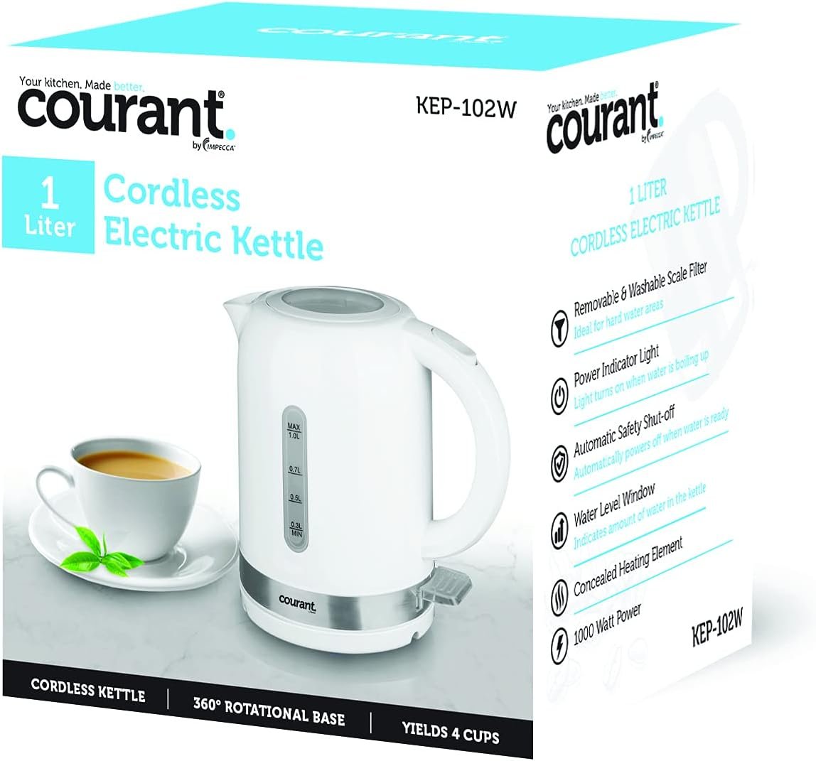 Courant Cordless Electric Kettle 1 Liter, 1000W 360 Rotational with LED Light for Tea Coffee Hot Chocolate Soup Hot Water, White