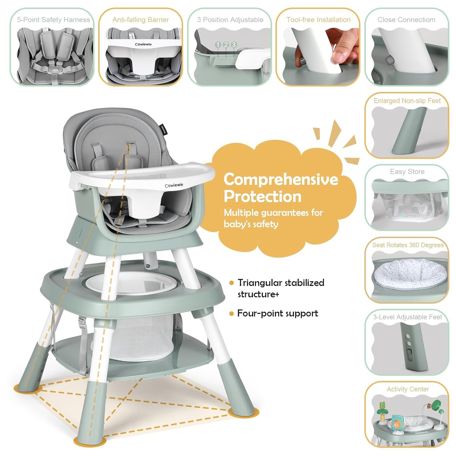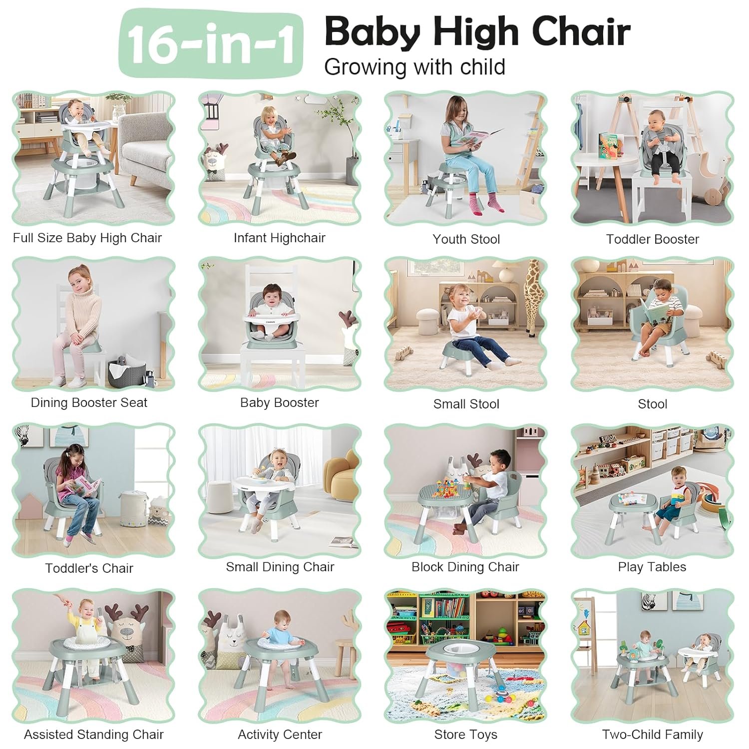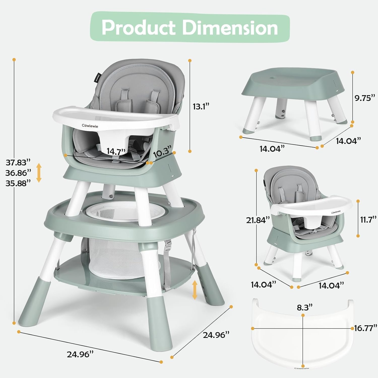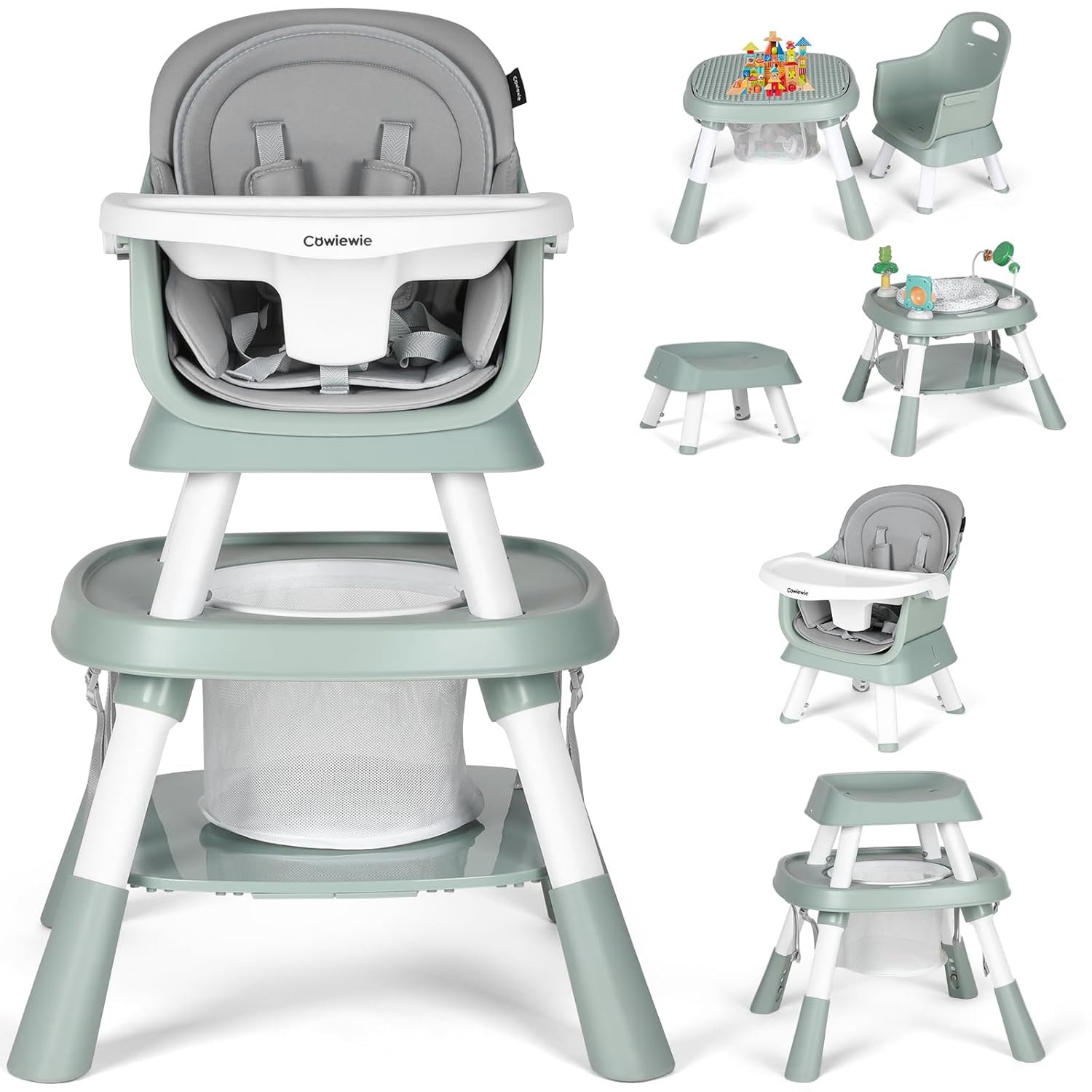 16-in-1 Baby High Chair – Cowiewie 16-in-1 baby high chair is designed to grow with child, offering 16 different configurations including a full-size infant high chair, infant booster seat, small dining chair, toddler chair with upholstery, universal child chair, child stool, play center, toddler table, and storage table. It can even be transformed into a block table and chair set, catering to the needs of growing babies, toddlers, and even adults.