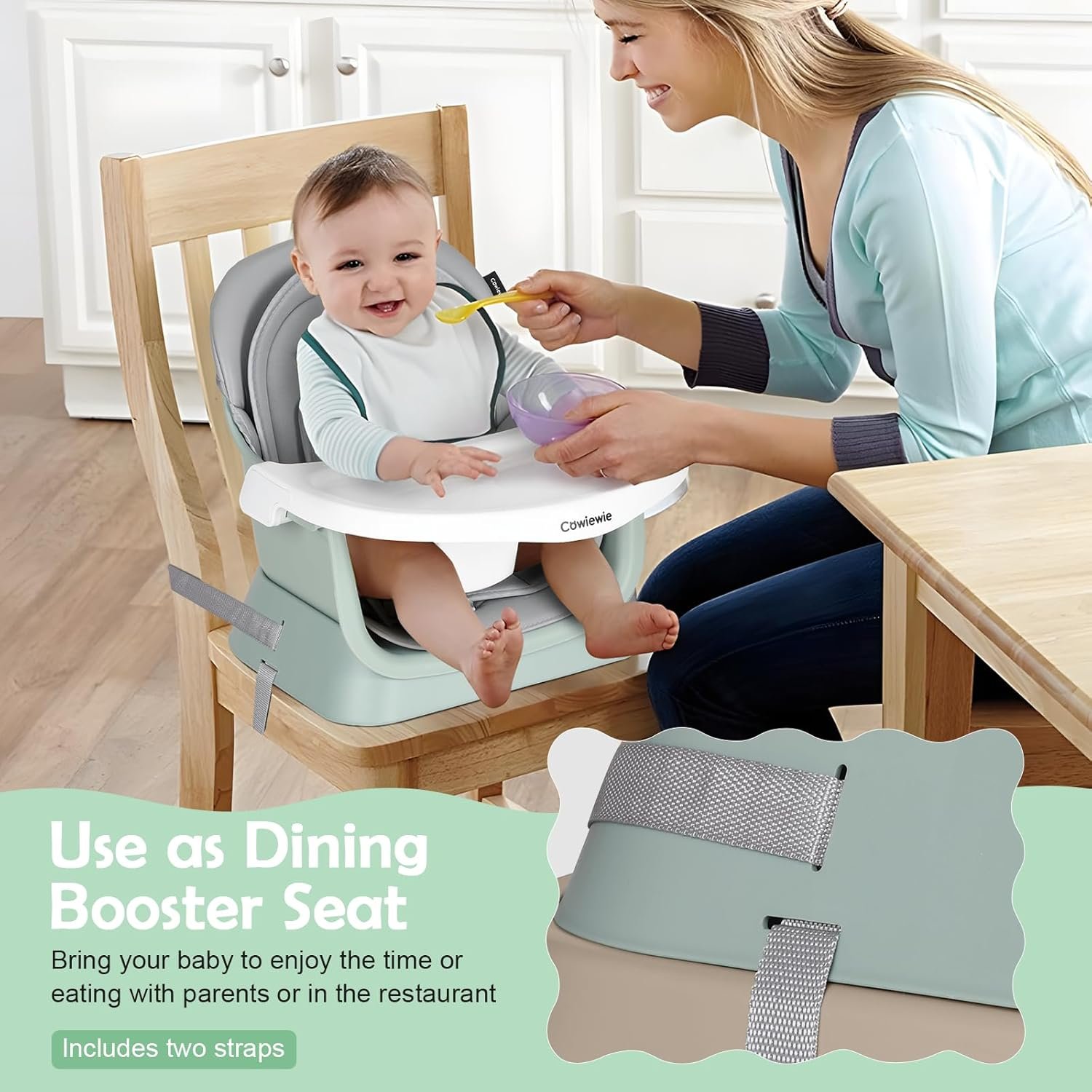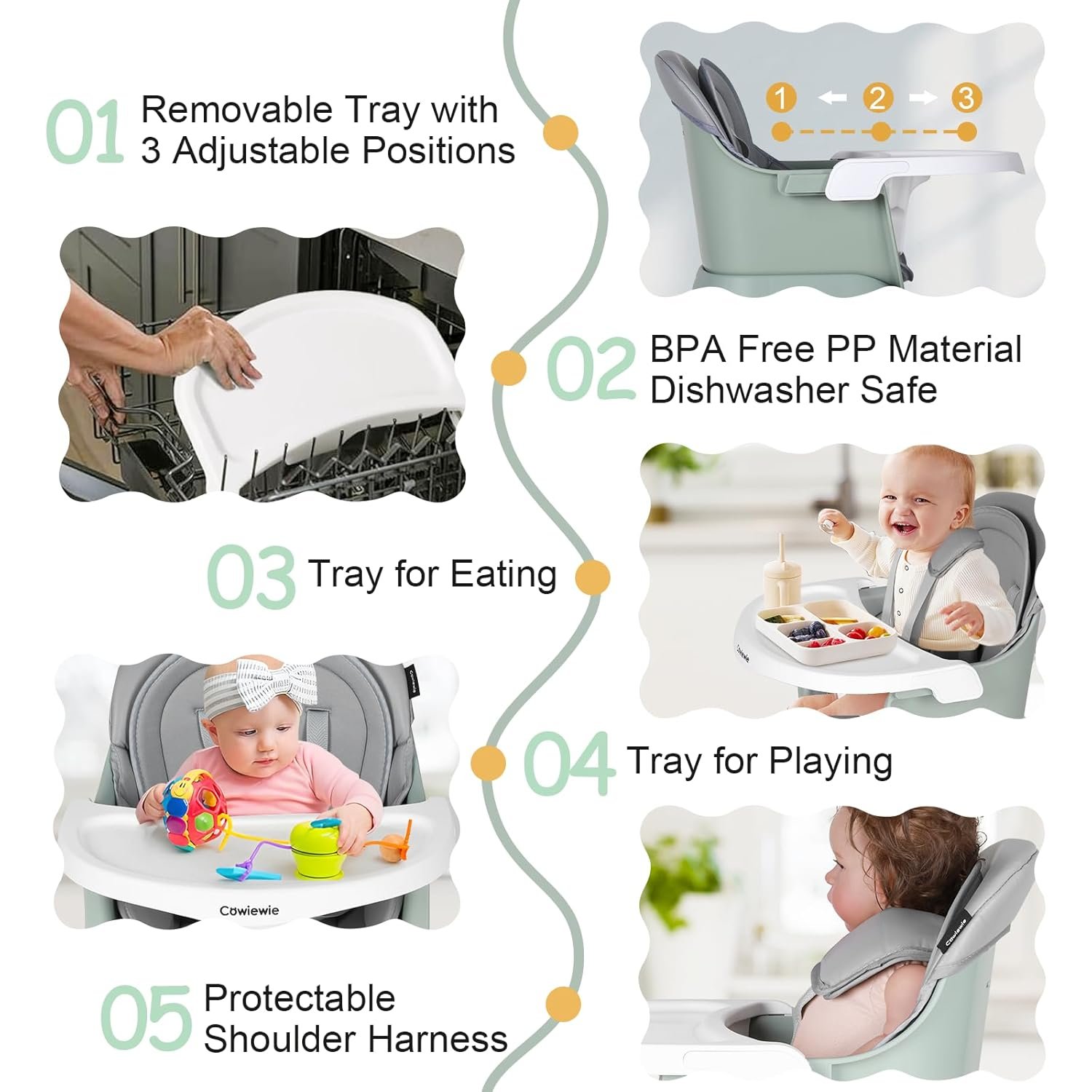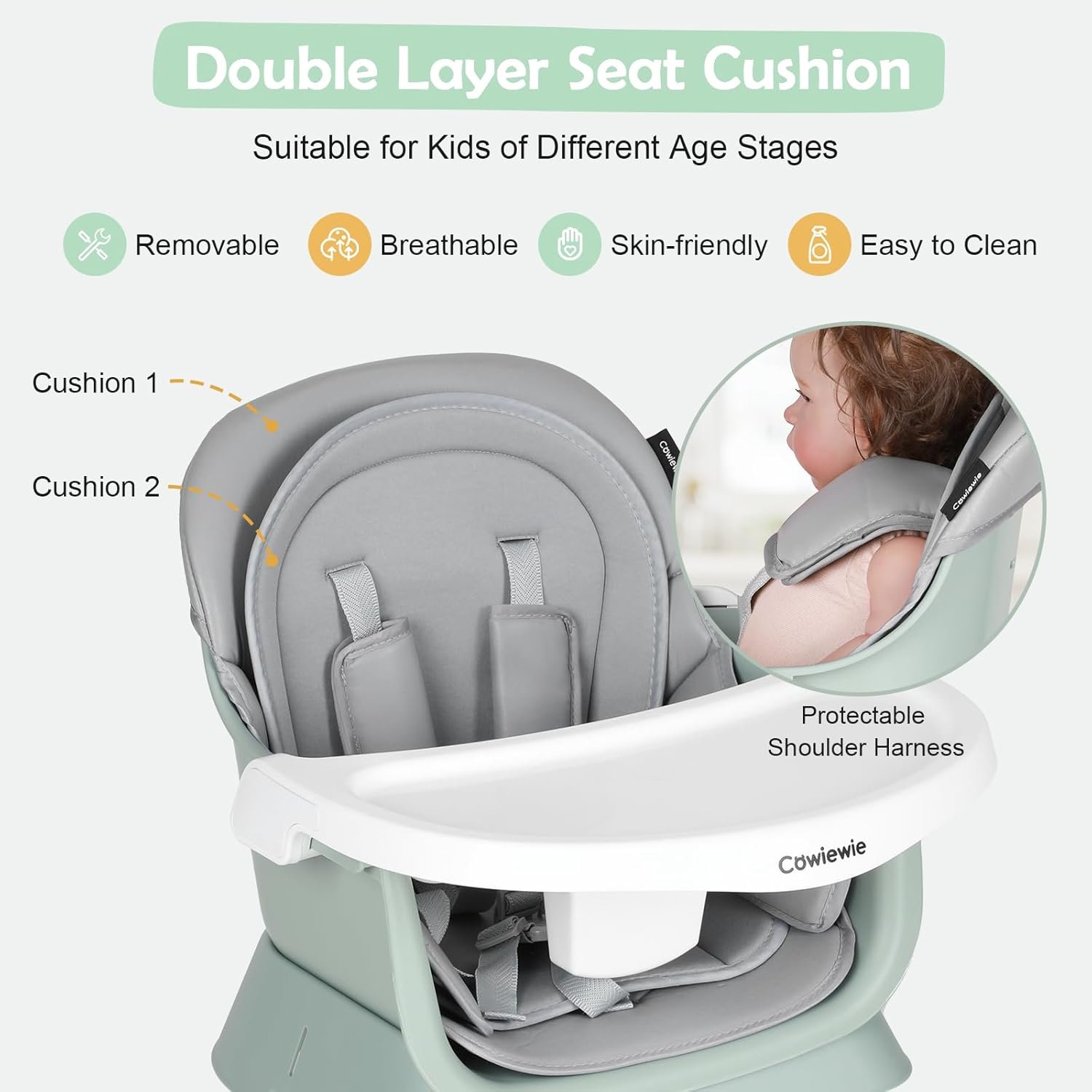 High-Quality & Safe Design – Cowiewie is committed to creating high-quality products for newborns to teens. The high chair is designed with armrests and a seat back with a wrap-around cushion to protect the spine. The five-point seat belt ensures maximum safety for your child.