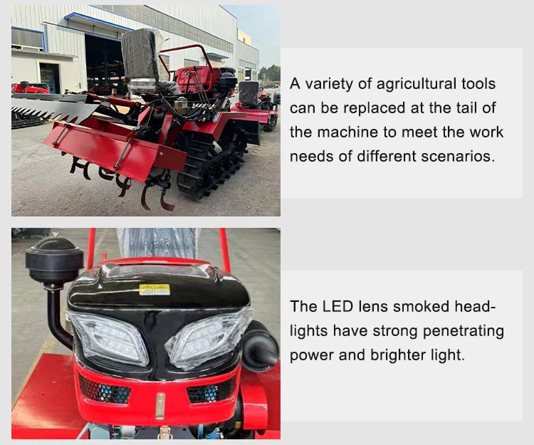 The compact Multi-function crawler tractor rotary tiller produced by our company standard with soil shovel, rotary tiller, ditching machine, weeding wheel, backfilling machine 5 kinds of agricultural tools; The machine is small, low center of gravity, easy to operate, can be rotated in place, strong applicability, can achieve large machinery can not enter the various mountains, hills, plains, dry land, paddy field, orchard, small land, greenhouse, tea garden, narrow land and other different terrain and soil operations. Suitable for a variety of soil: frozen soil, hard soil, clay, black soil, mountain, soft soil can be used.