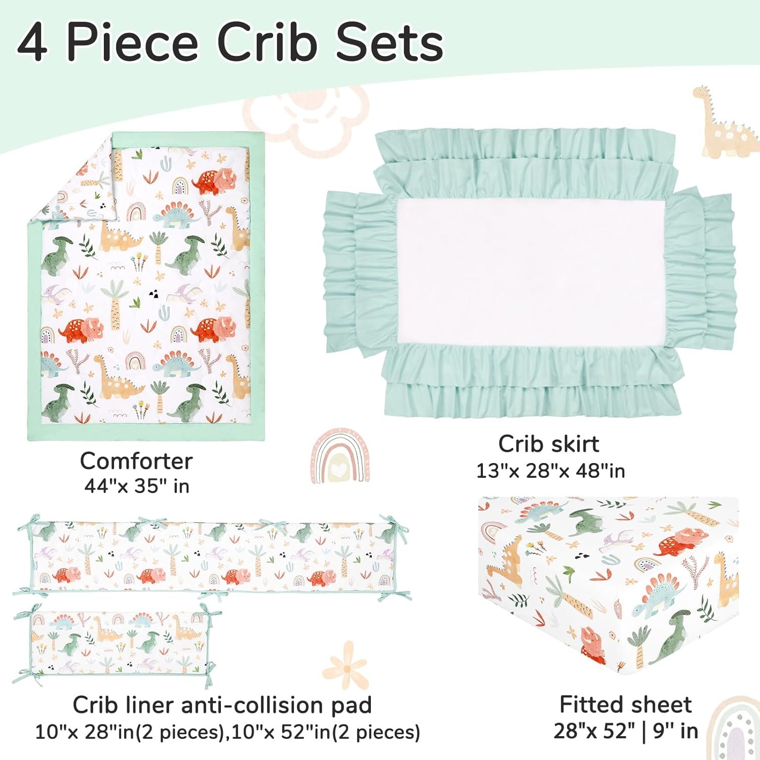 Crib Bedding set: The dinosaur crib bedding set including a matching bed skirt(13″x 28″x 48″), a crib liner anti-collision padding(2 long+2 short), a reversible comforter(44″ x 35″) and a fitted sheet(29″ x 52″ x 9”). All our bedding are designed according to toddler bed size standards.