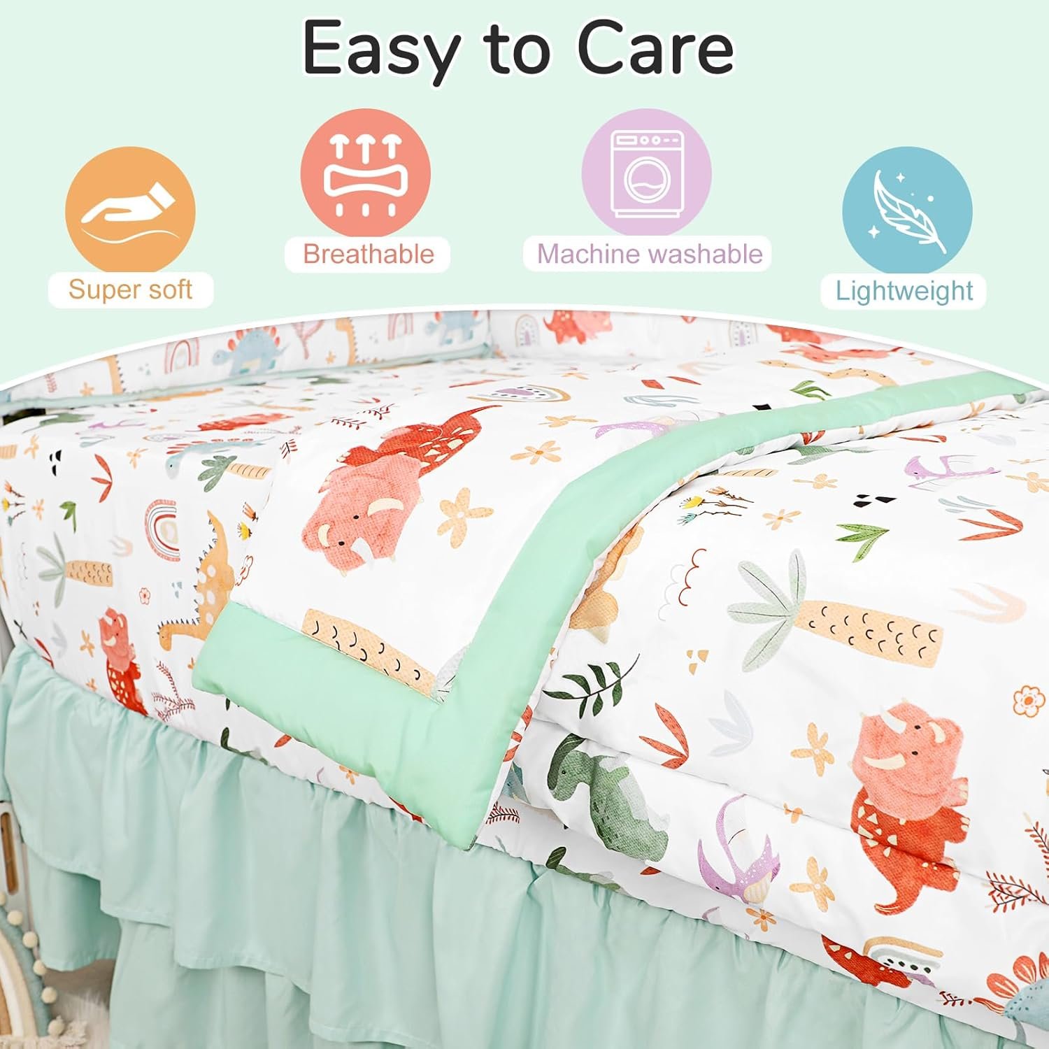 Optimal Comfort: The baby crib bedding set is made of brushed microfiber material combined with soft polyester fabrics, skin-friendly and comfortable to give best care at baby sleep. The crib comforter is lightweight and breathable, providing baby with a cozy tactile experience, ideal for all seasons.