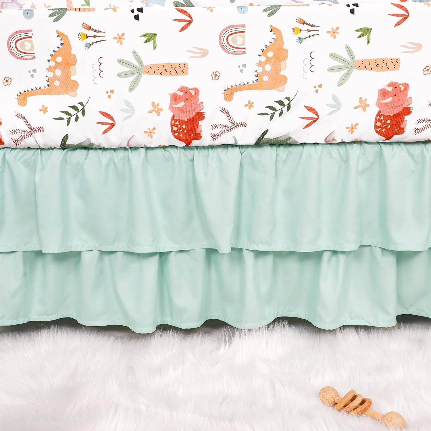 Dinosaur Theme: Featuring adorable dinosaurs, rhinos and other animals, accented with rainbows and plants, with a touch of green to add a lively and vibrant touch to your baby’s nursery.
