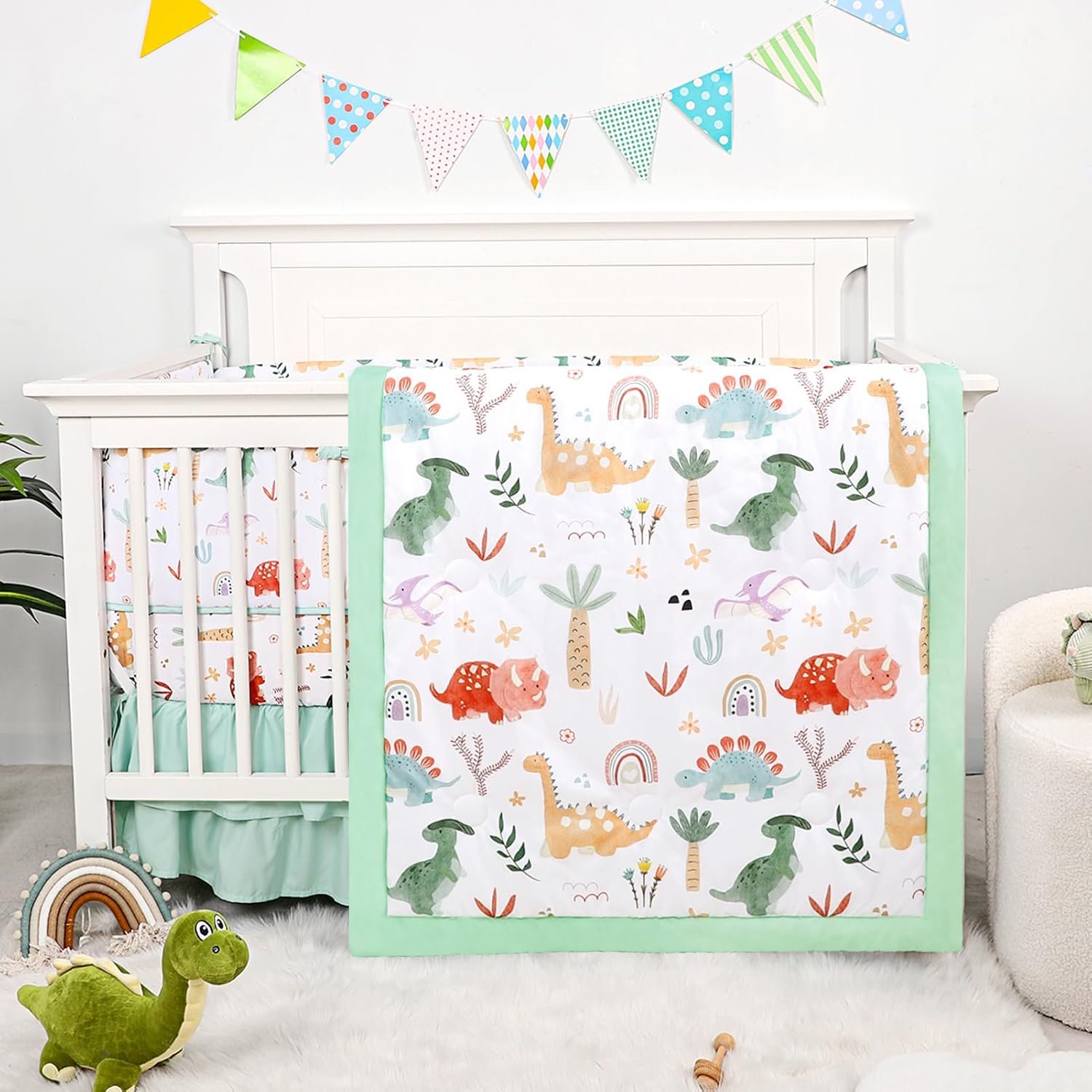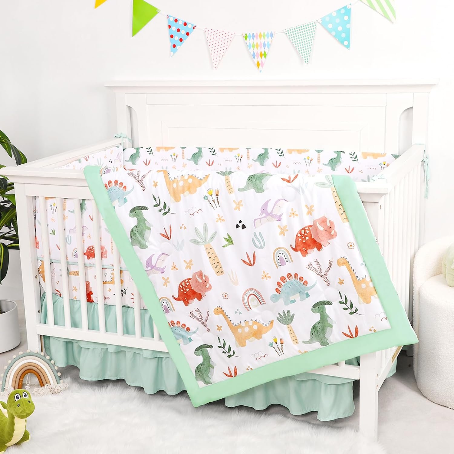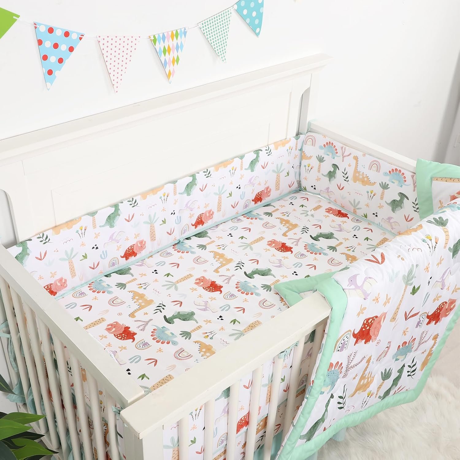Crib Bedding Set for Boys Girls, Upgrade 4 Pieces Nursery Bedding Set for Newborn Infant, Includes Crib Liner Anti-Collision Padding, Comforter, Fitted Sheet, Bed Skirt, Dinosaur