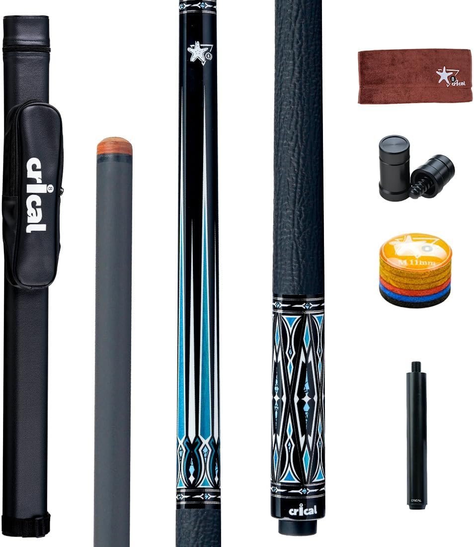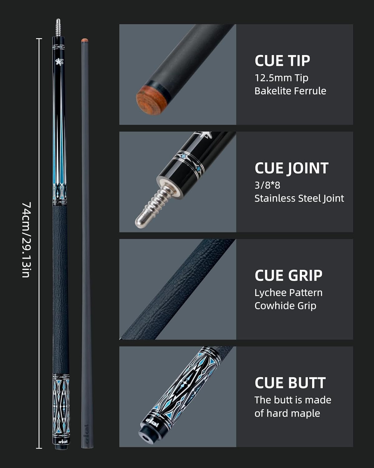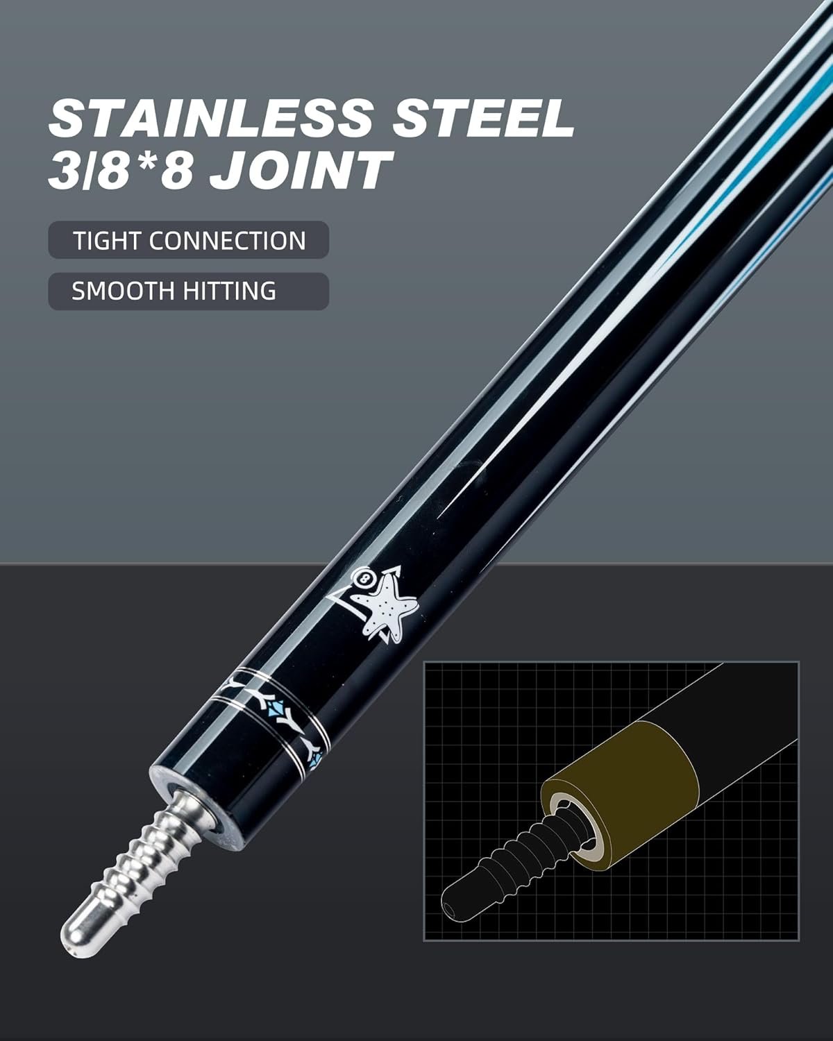 Professional Carbon Fiber Cue Stick: This pool stick is 58 inches long and weighs 18.5-20 ounces. It is designed as a two-piece pool cue with a 12.5mm tip and a 3/8*8 stainless steel joint