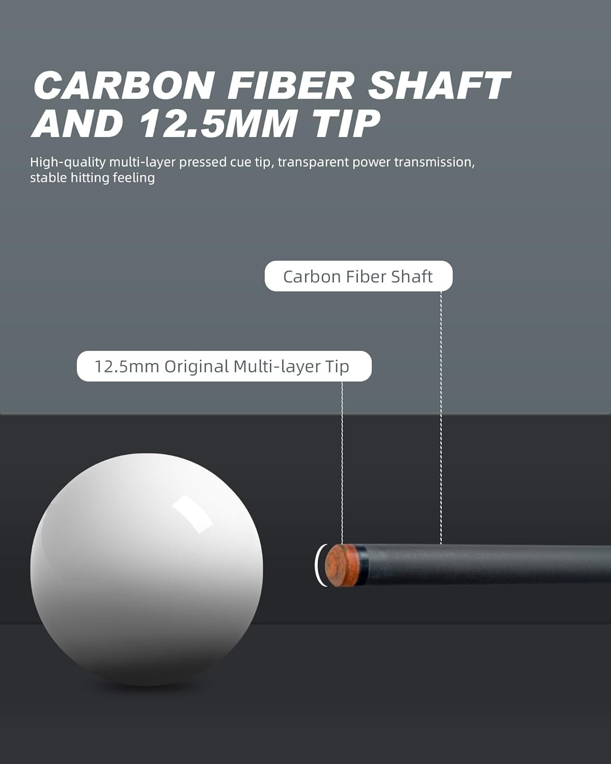 Premium 12.5mm Tip: Equipped with a professional 12.5mm pigskin tip, this carbon fiber pool cue offers superior grip and feedback for precise spin and accuracy. The high-quality leather ensures durability and optimal playability