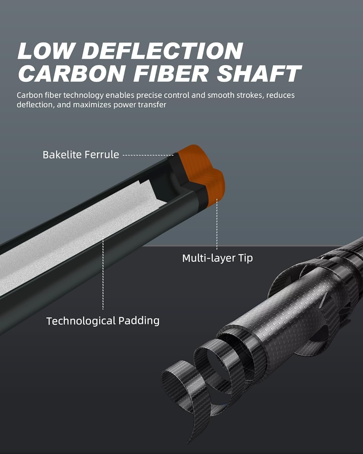 High-Performance Carbon Fiber Shaft: The carbon fiber cue shaft is engineered with built-in foam to reduce deflection, absorb vibration, and enhance stability. This low-deflection pool cue stick delivers explosive power while maintaining delicate control, giving you an edge in every shot
