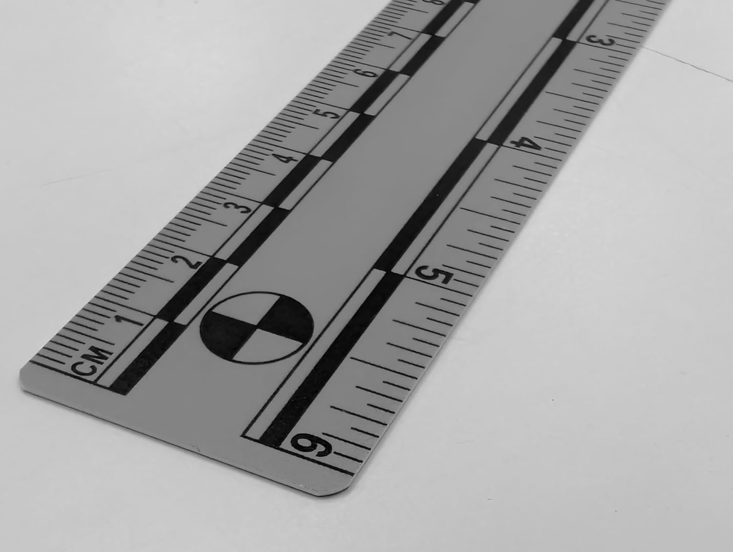 These professional-grade vinyl photo scales are essential tools for precise evidence documentation and crime scene photography. Each 6-inch scale features clear dual measurements in both inches and millimeters, with a non-reflective white surface that ensures optimal visibility in photographs. The distinctive crosshair circles at both ends enable accurate photogrammetry correction and measurement calibration. The pack includes 10 durable vinyl scales, each with a convenient blank center area for recording case-specific information. The scales’ flat, non-glare finish minimizes unwanted reflections, helping photographers capture clear, detailed images of evidence. These measurement tools are specifically designed for forensic photography, making them indispensable for law enforcement professionals, crime scene investigators, and forensic specialists who require precise dimensional documentation in their photographic evidence.