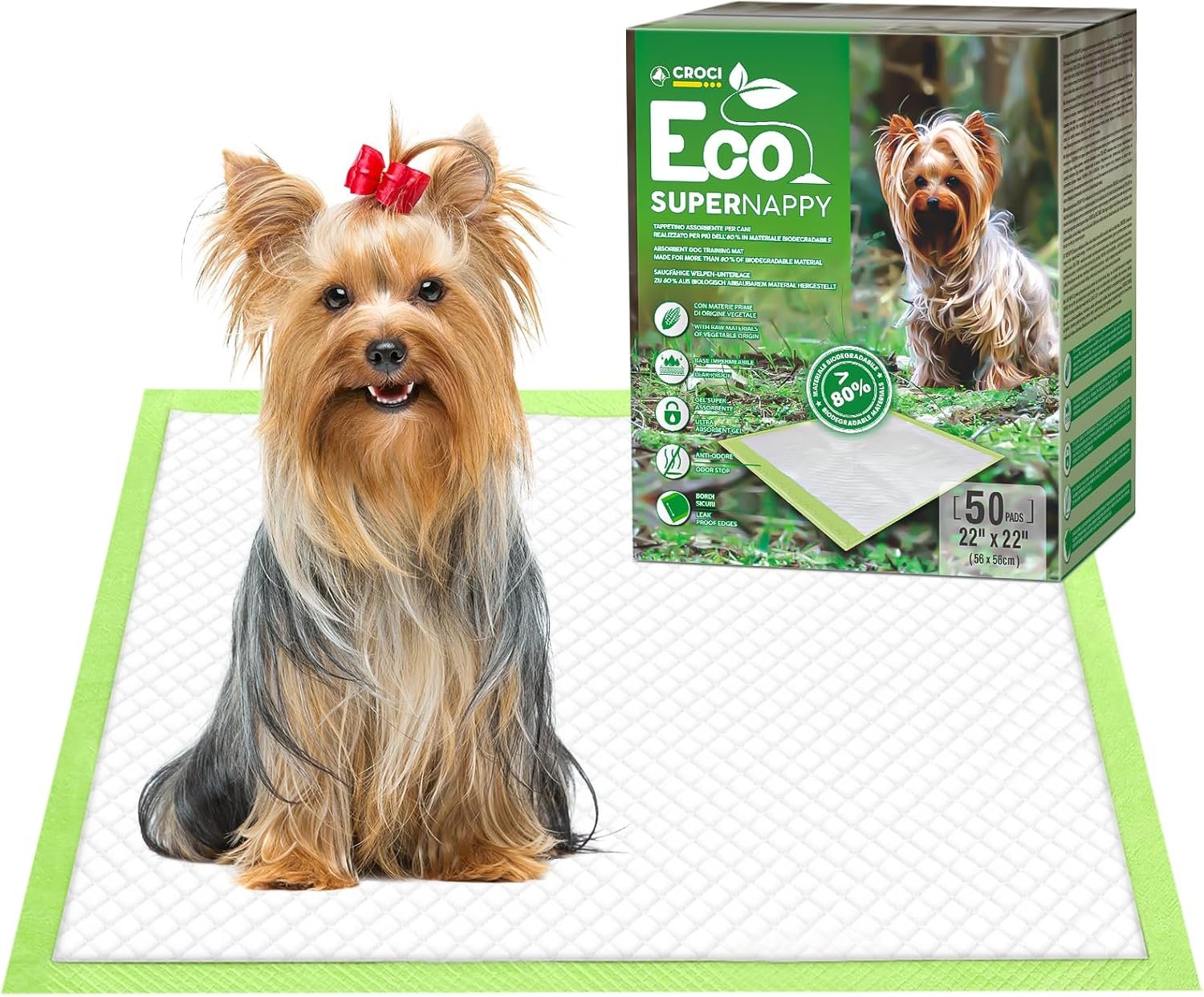 CROCI Puppy Pads 22x22in ECO Green Dog Pee Pads , Plant-Based Dogs Pads Absorbs Up to 4 Cups of Liquid, 5-Layer Leak-Proof & Quick Drying Pee Pads for Dogs, Disposable (50 Counts)