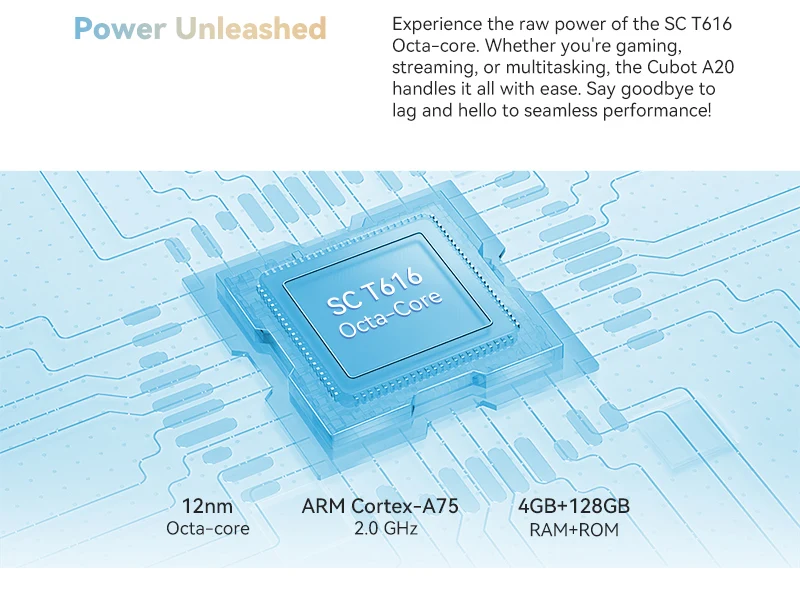 CPU: SC T616 Octa-core(12nm 2*A75 2.0GHz+6*A55 1.8GHz)