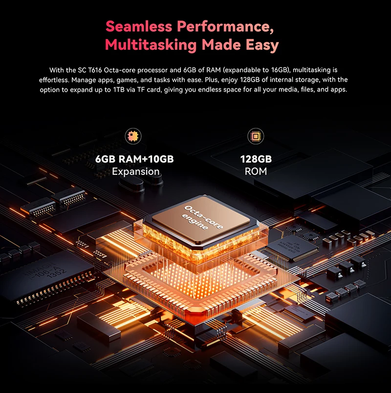 With the SC T616 Octa-core processor and 6GB of RAM (expandable to 16GB), multitasking is effortless. Manage apps, games, and tasks with ease. Plus, enjoy 128GB of internal storage, with the option to expand up to 1TB via TF card, giving you endless space for all your media, files, and apps.