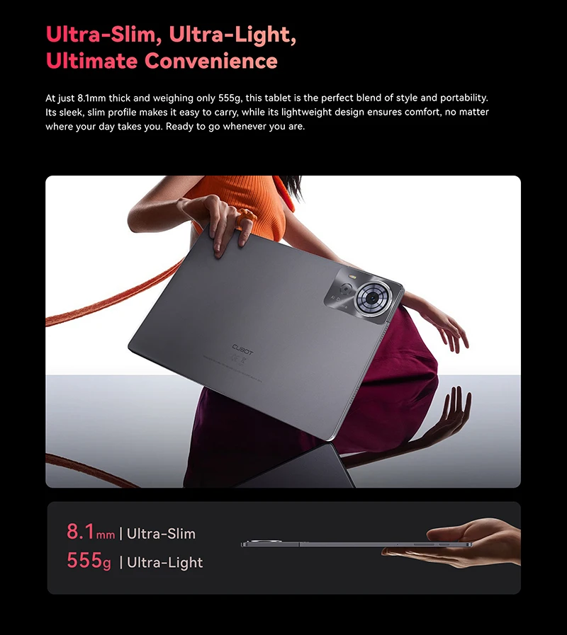 At just 8.1mm thick and weighing only 555g, this tablet is the perfect blend of style and portability. Its sleek, slim profile makes it easy to carry, while its lightweight design ensures comfort, no matter where your day takes you. Ready to go whenever you are.