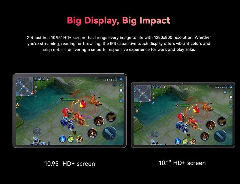 Get lost in a 10.95″ HD+ screen that brings every image to life with 1280×800 resolution. Whether you’re streaming, reading, or browsing, the IPS capacitive touch display offers vibrant colors and crisp details, delivering a smooth, responsive experience for work and play alike