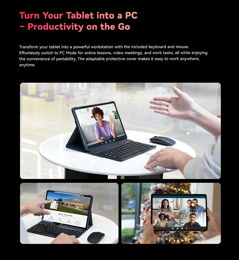 Transform your tablet into a powerful workstation with the included keyboard and mouse. Effortlessly switch to PC Mode for online lessons, video meetings, and work tasks, all while enjoying the convenience of portability. The adaptable protective cover makes it easy to work anywhere, anytime.