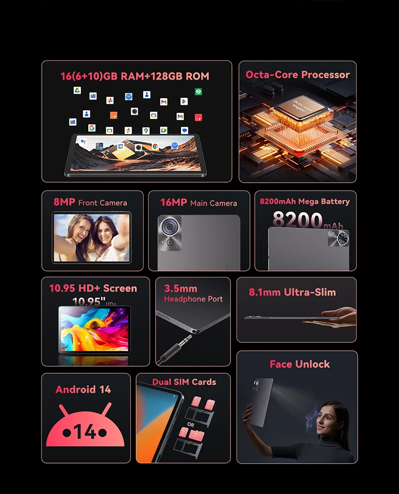 Cubot TAB 70, 2025 New Tablet Android 14, Octa-Core, 16GB RAM(6GB+10GB), 128GB ROM, 10.95″ HD+ Screen, 8200mAh, GPS, Face ID