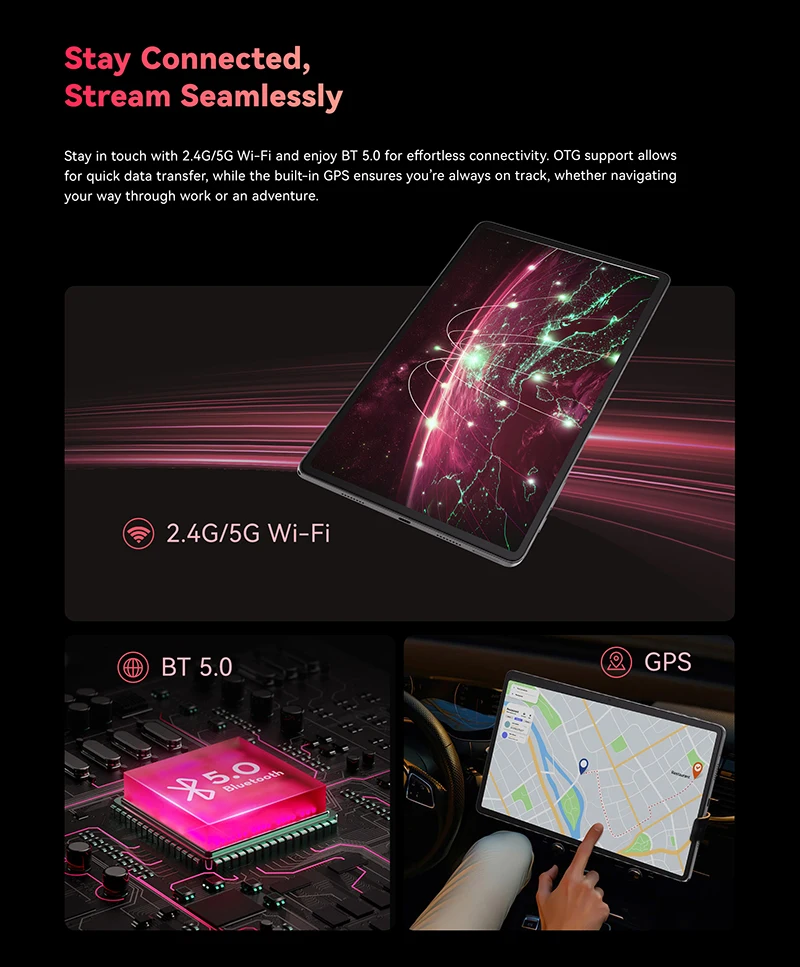 Stay in touch with 2.4G/5G Wi-Fi and enjoy BT 5.0 for effortless connectivity. OTG support allows for quick data transfer, while the built-in GPS ensures you̢۪re always on track, whether navigating your way through work or an adventure.