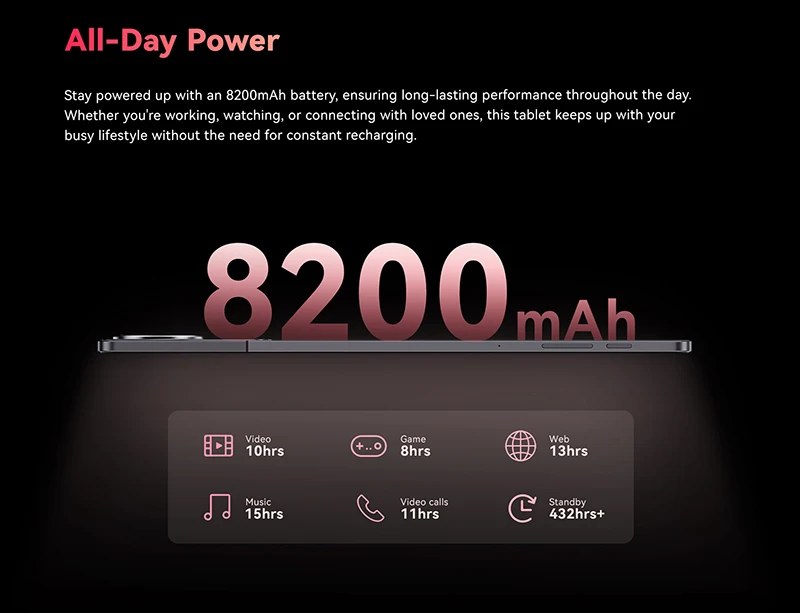 Stay powered up with an 8200mAh battery, ensuring long-lasting performance throughout the day. Whether you’re working, watching, or connecting with loved ones, this tablet keeps up with your busy lifestyle without the need for constant recharging.