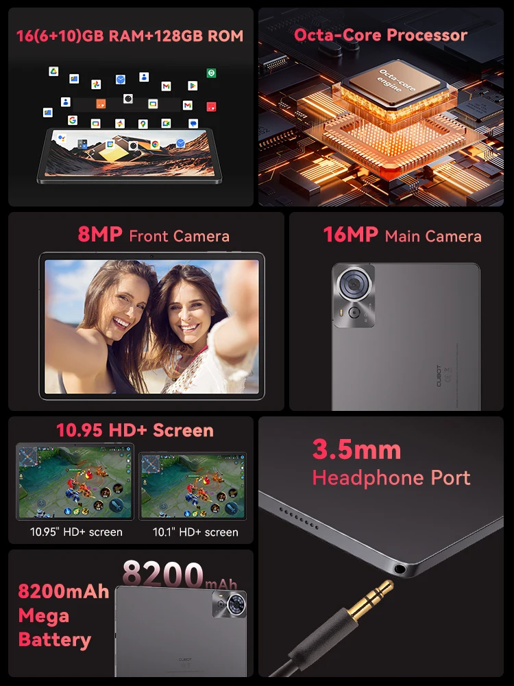 Cubot TAB 70, 2025 New Tablet Android 14, Octa-Core, 16GB RAM(6GB+10GB), 128GB ROM, 10.95″ HD+ Screen, 8200mAh, GPS, Face ID