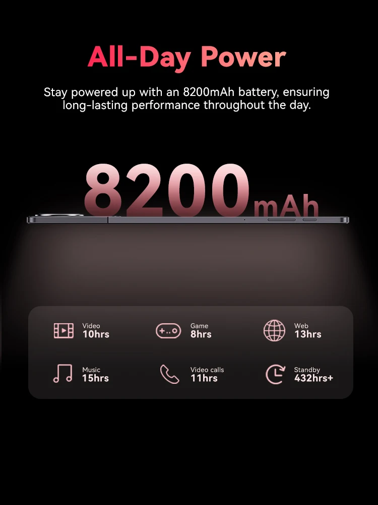 Stay powered up with an 8200mAh battery, ensuring long-lasting performance throughout the day. Whether you’re working, watching, or connecting with loved ones, this tablet keeps up with your busy lifestyle without the need for constant recharging.
