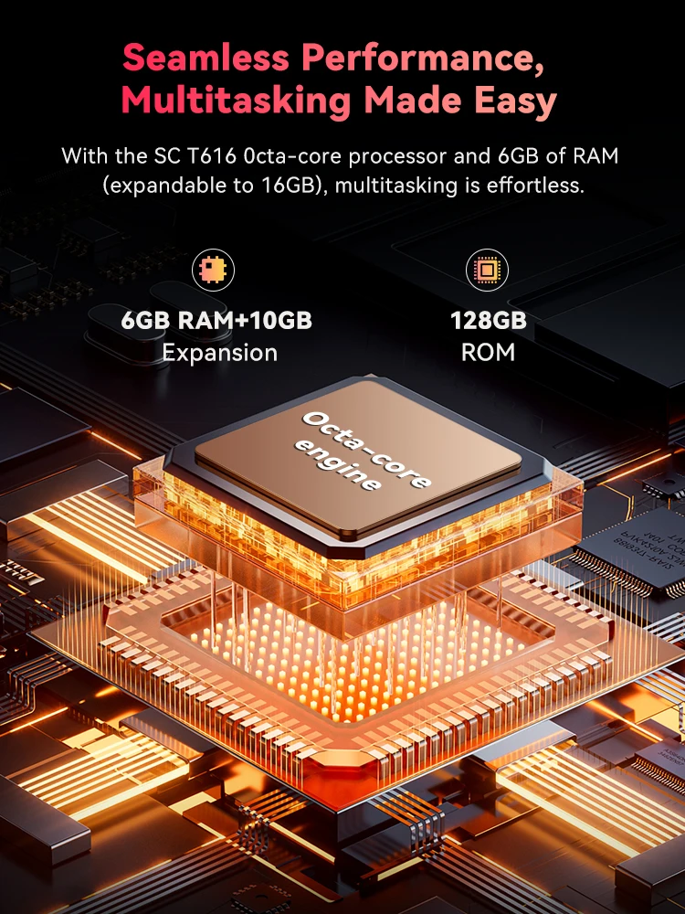 With the SC T616 Octa-core processor and 6GB of RAM (expandable to 16GB), multitasking is effortless. Manage apps, games, and tasks with ease. Plus, enjoy 128GB of internal storage, with the option to expand up to 1TB via TF card, giving you endless space for all your media, files, and apps.