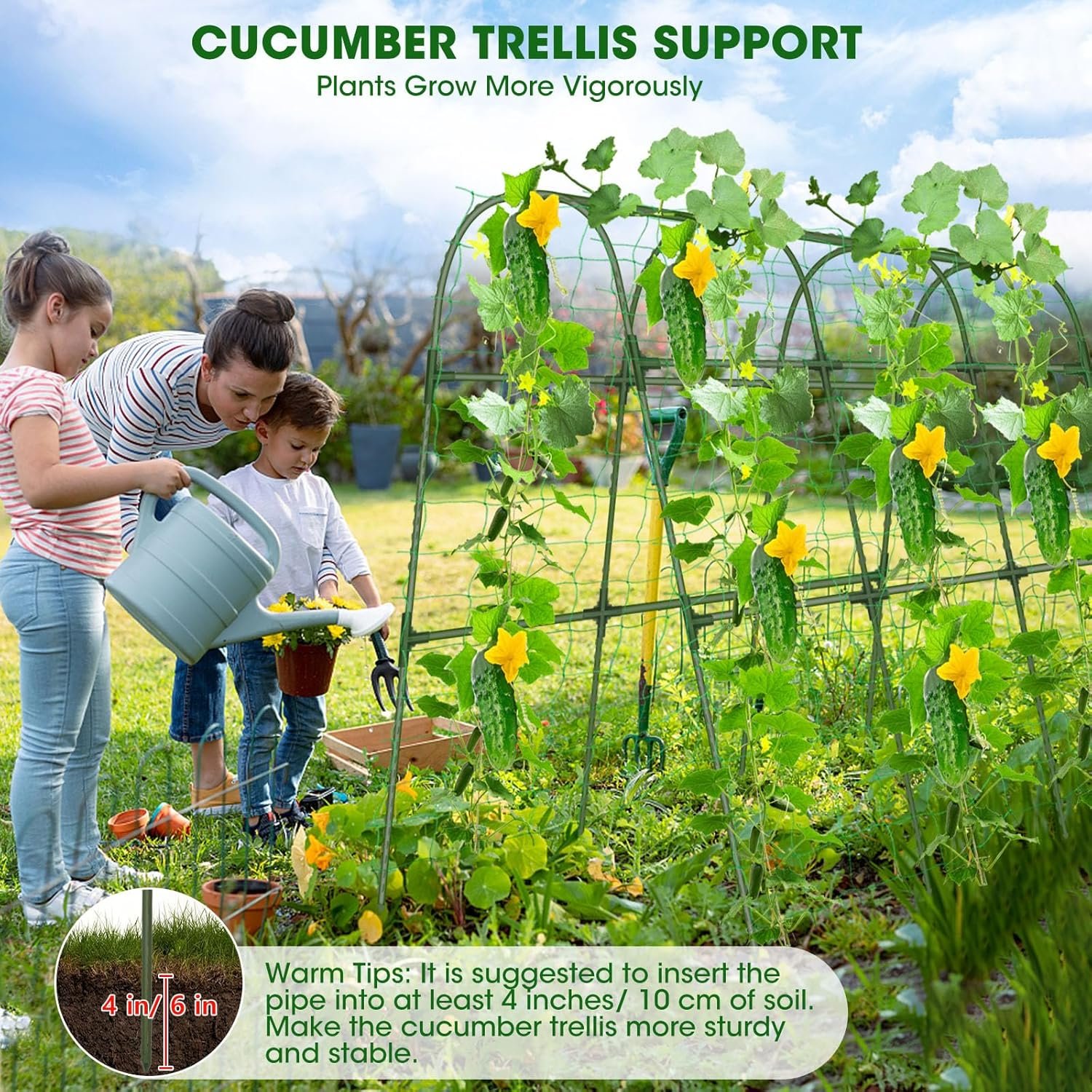 【Package Detail】Super High Cucumber Trellis X1(47.2×47.2″X21.6″),Garden clips X20,Leaf Ties X100,Twist Tie X1,Trellis NettingX1,Manual X1.
