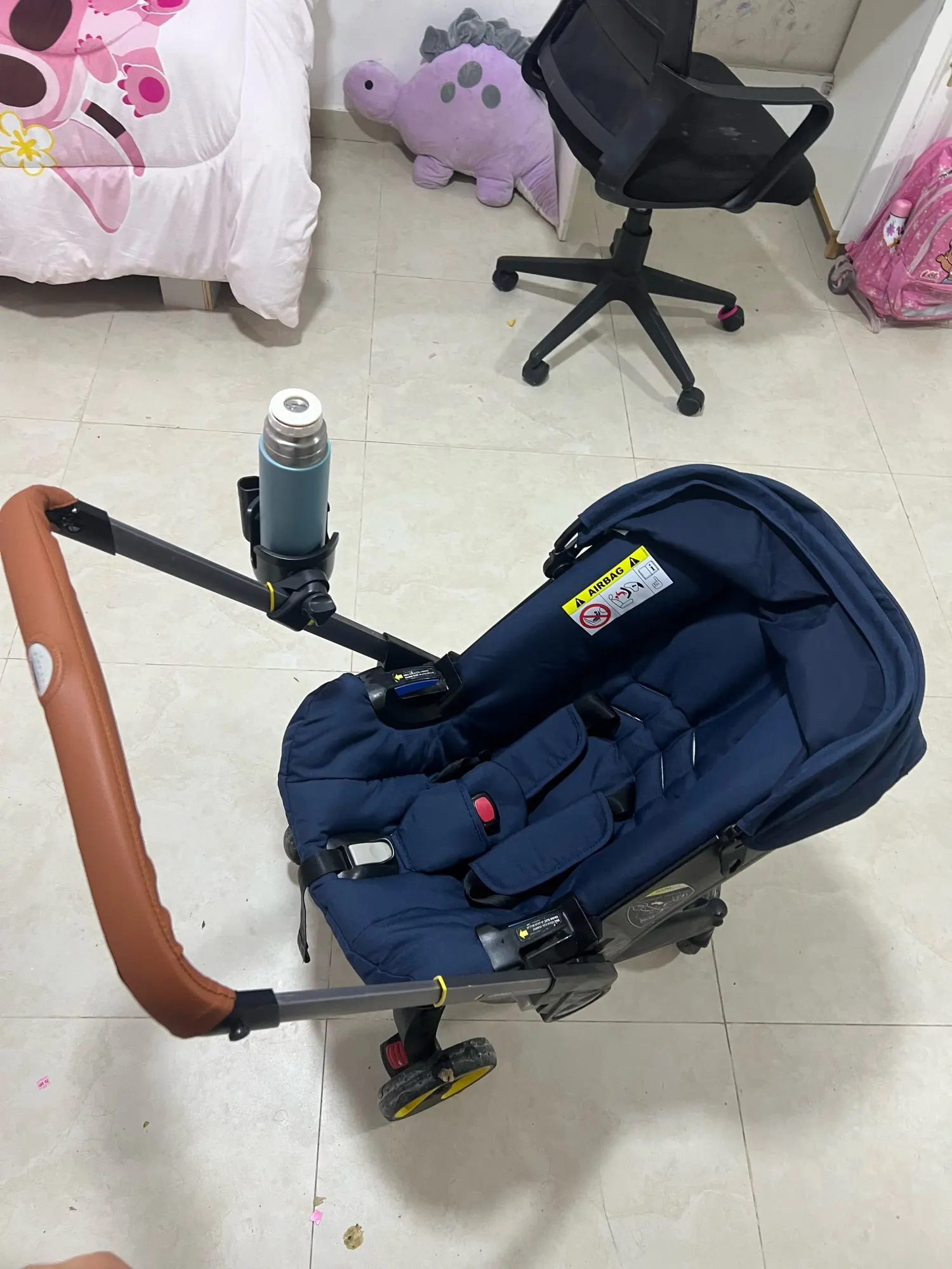 Does not fold, does not screw well to the stroller, falls off every second.