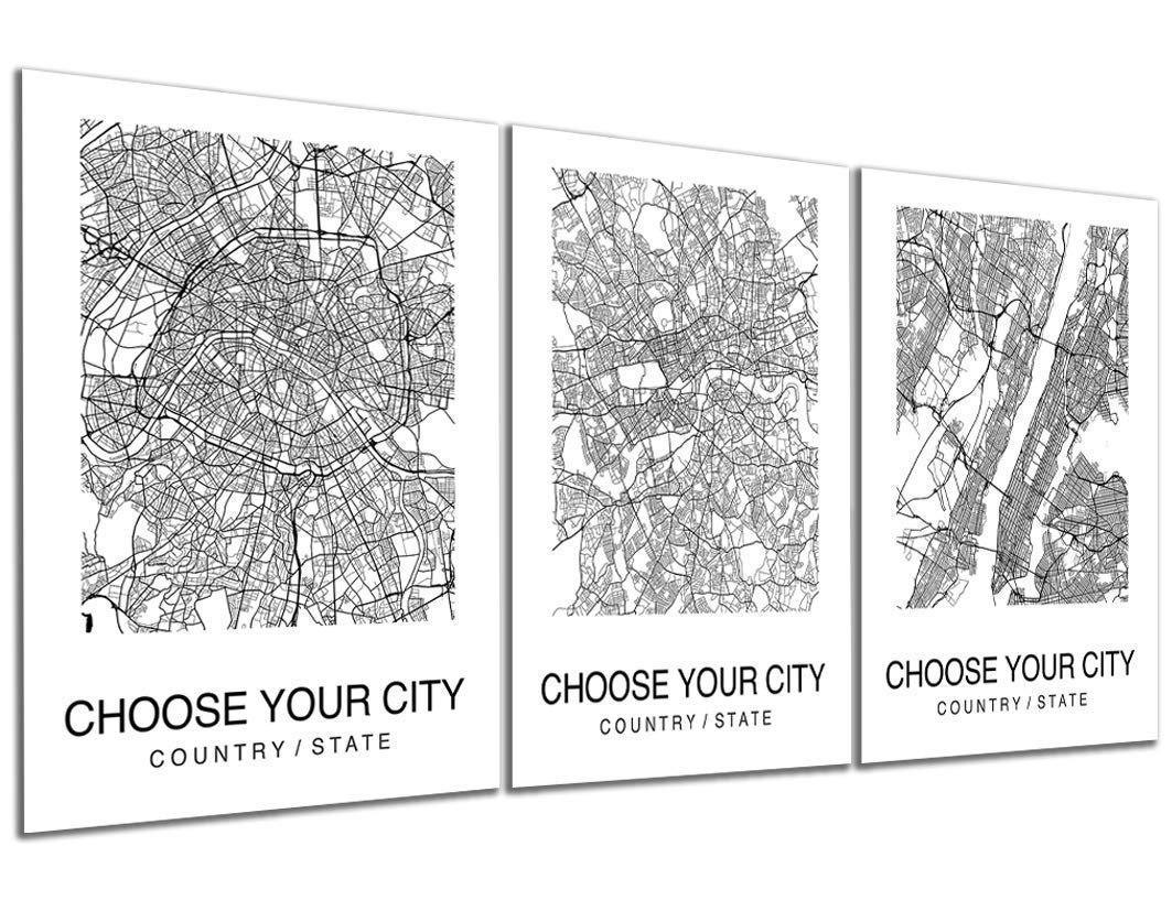 Custom Map Wall Art Print Poster Set of 3 City Map Street Black & White