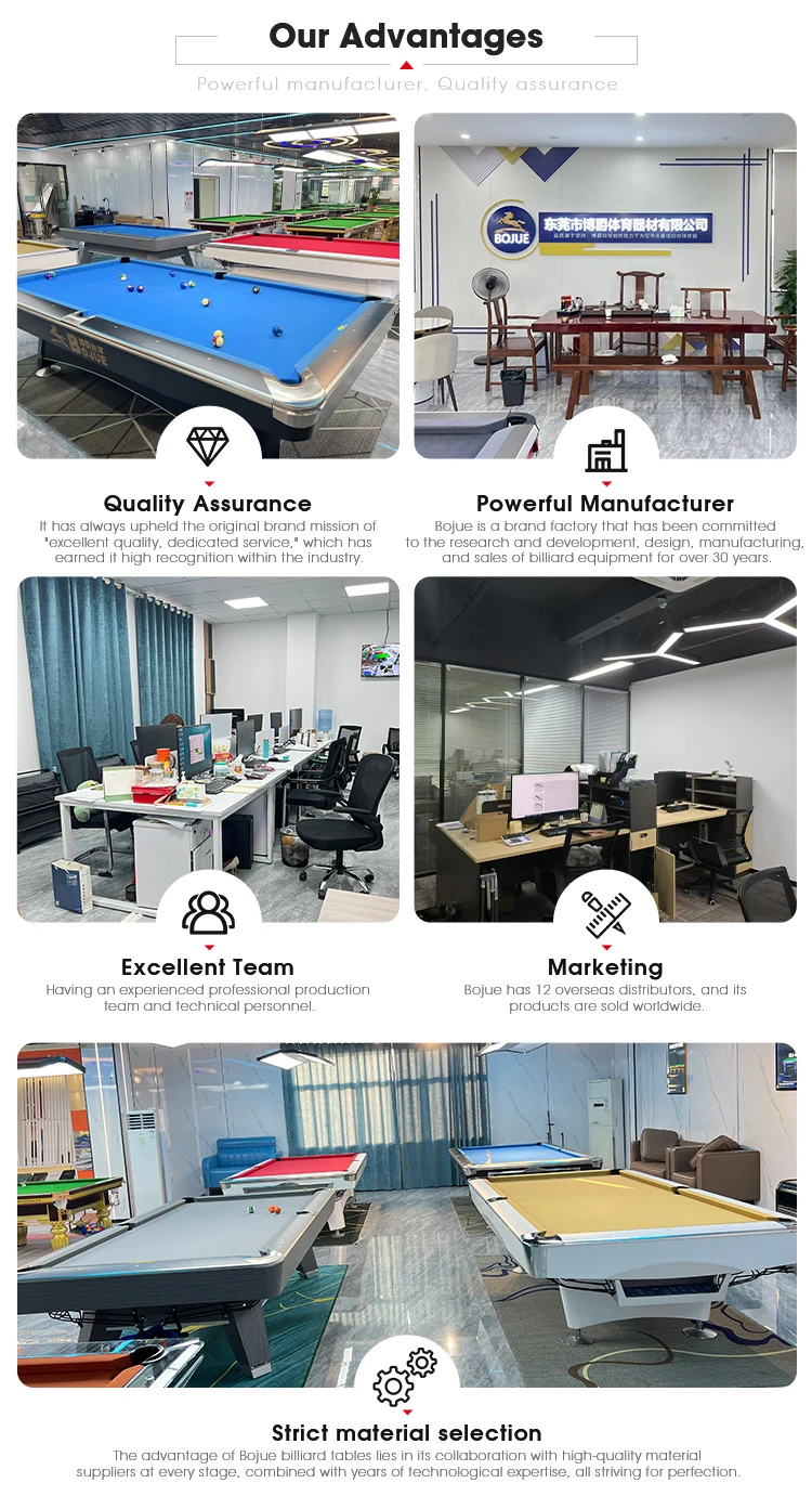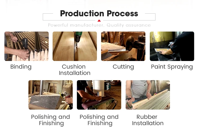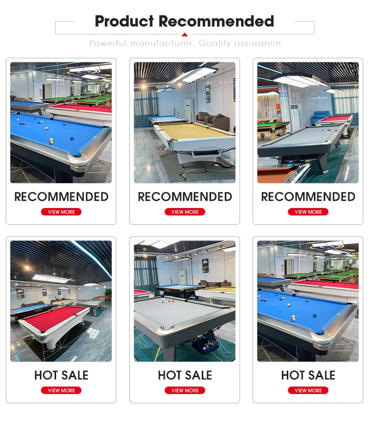 Q:What’s table size for 9ft 8ft ? Table size 锛坥uter diameter锛�: 8ft: 2560*1400*800mm 9ft: 2920*1630*800mm Playing specs: 8ft: 2300 * 1200 mm (90″*47″) 9ft: 2540 * 1270 mm (100″*50″) Pocket size: Corner pockets : 10.5 – 10.8cm Middle pockets: 11.5 – 12cm Q. What size room do I need? Room Size=Playing room+ 2 Cues Length (147cm) 7ft pool table room size: 397cm x 498cm 8ft pool table room size: 440cm x550cm 9ft pool table room size: 460cm x 590cm 10ft snooker table room size: 438cm x 580cm 12ft snooker room size: 473cm x 652cm Q. How About Shipping? We could arrange shipping to your nearest seaport (CIF Term), In this way, You have a destination port fee and you do custom clearance and picking up at your nearest seaport. EXW銆丗CA銆丗OB available. Please contact us for shipping details before ordering, Q. How about Installation? We could offer installation guide/ Videos. Q. How long is the production time? Normally 10 days for one set. 35 days for container. Q. How long is the warranty? Warranty scope: non-personnel damage and environmental impact damage to the main frame of the table, lapis lazuli, the warranty period of 5 years, of which the table accessories (balls, cues, tablecloths, leather mouth, track, etc.) are not under warranty.Our tables are absolutely rocking solid,And they will look as good after 10 years as they did the day they were installed. Q. Are the pool tables drop pocket or ball return? Normally ball return,can downgrading become drop pocket Q. What is wooden packing info for one table? Weight-500kgs Volume-1.6cbm (single table with wooden box锛塡r Q.How to buy ? After you confirming your order demands, We send you Proforma Invoice with all order details. And we will send you the order payment link, You can pay us by online through Alibaba. It’s very safe and has trade assurance for your order. Available Payment methods in payment link : visa, mastercard, T/T, PAYPAL, APPLE_PAY, GOOGLE_PAY, GC_REAL_TIME_BANK_TRANSFER