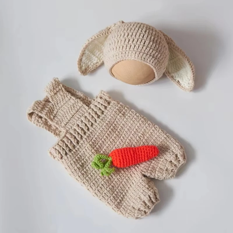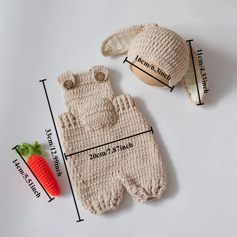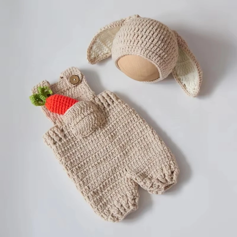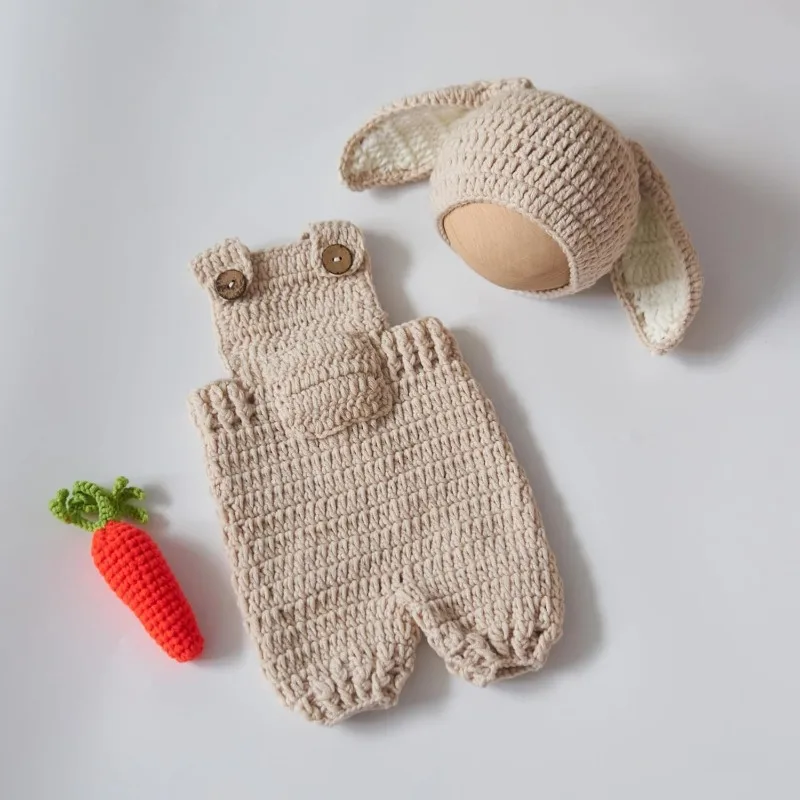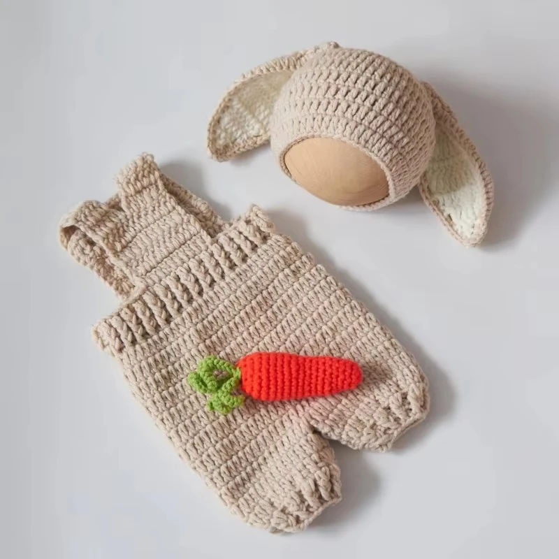 Cute Bunny Costume Newborn Photography Outfits Soft Knitted Rabbit Shape Hat and Jumpsuits with Carrot Clothes Baby Photo Props