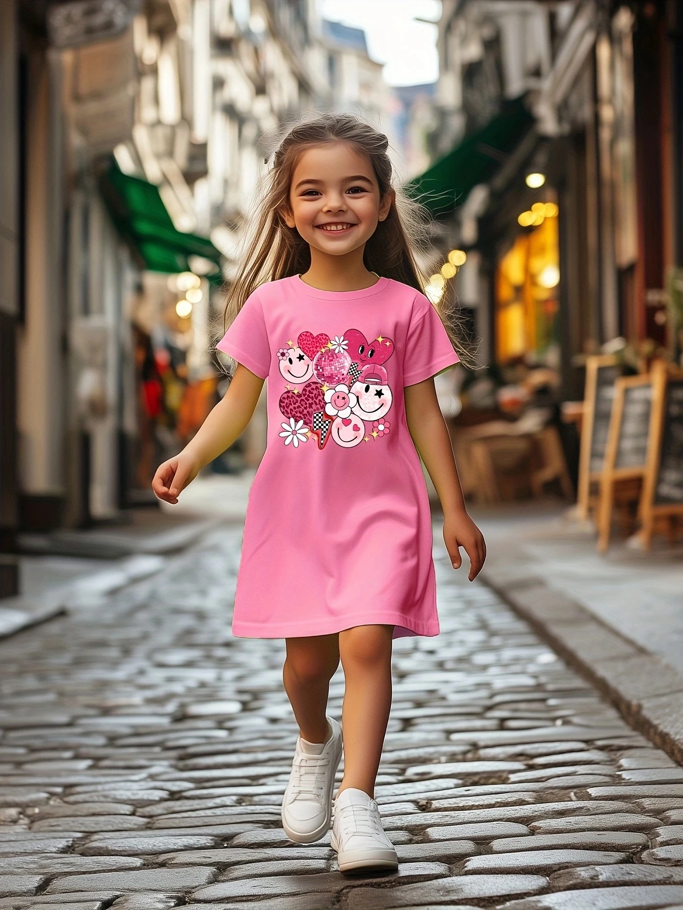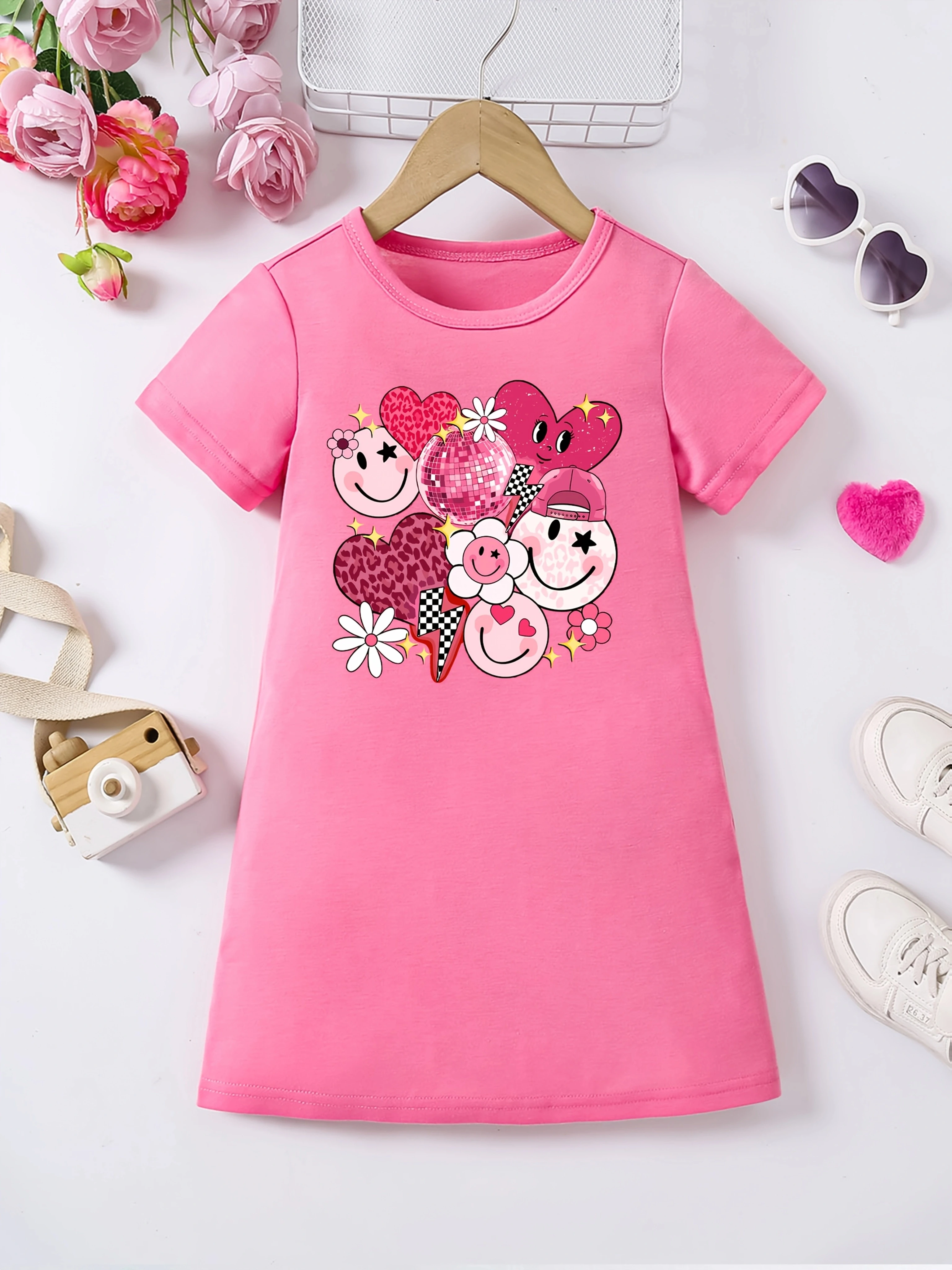 Cute summer fashion cartoon printed casual dress for girls, soft, breathable, and elastic polyester fiber blend dress