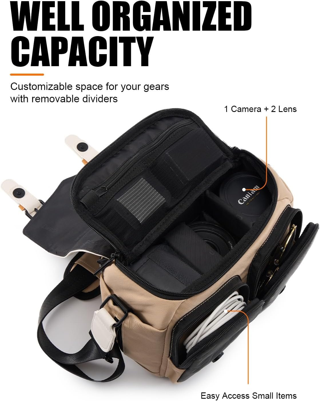 ✅【Customizable Space for Your Gear】The camera shoulder bag has dimensions of 10″L x 5.5″W x 7″H and weighs only 1.6lb, ensuring lightweight portability. It can accommodate 1 DSLR and 2 lens, organize your camera gear, lenses, and accessories exactly as you need with the customizable interior featuring removable padded dividers.