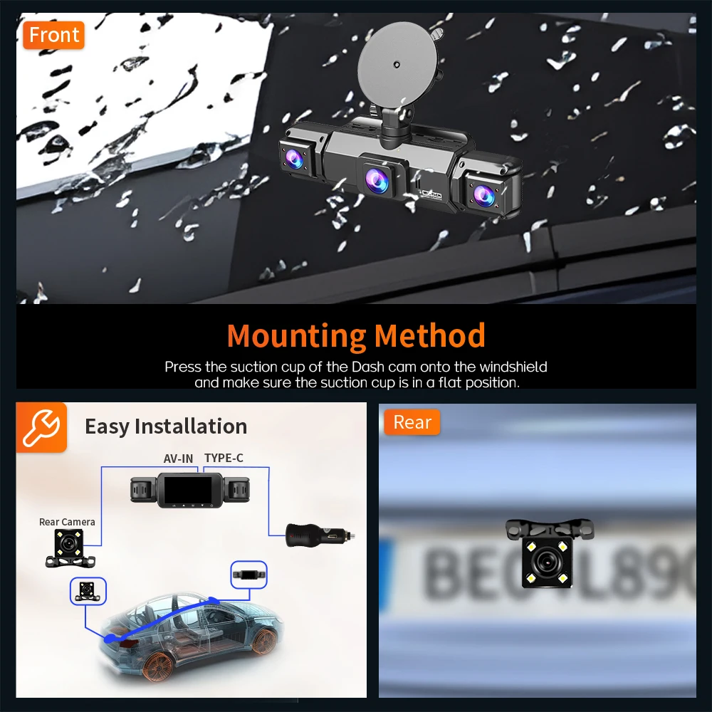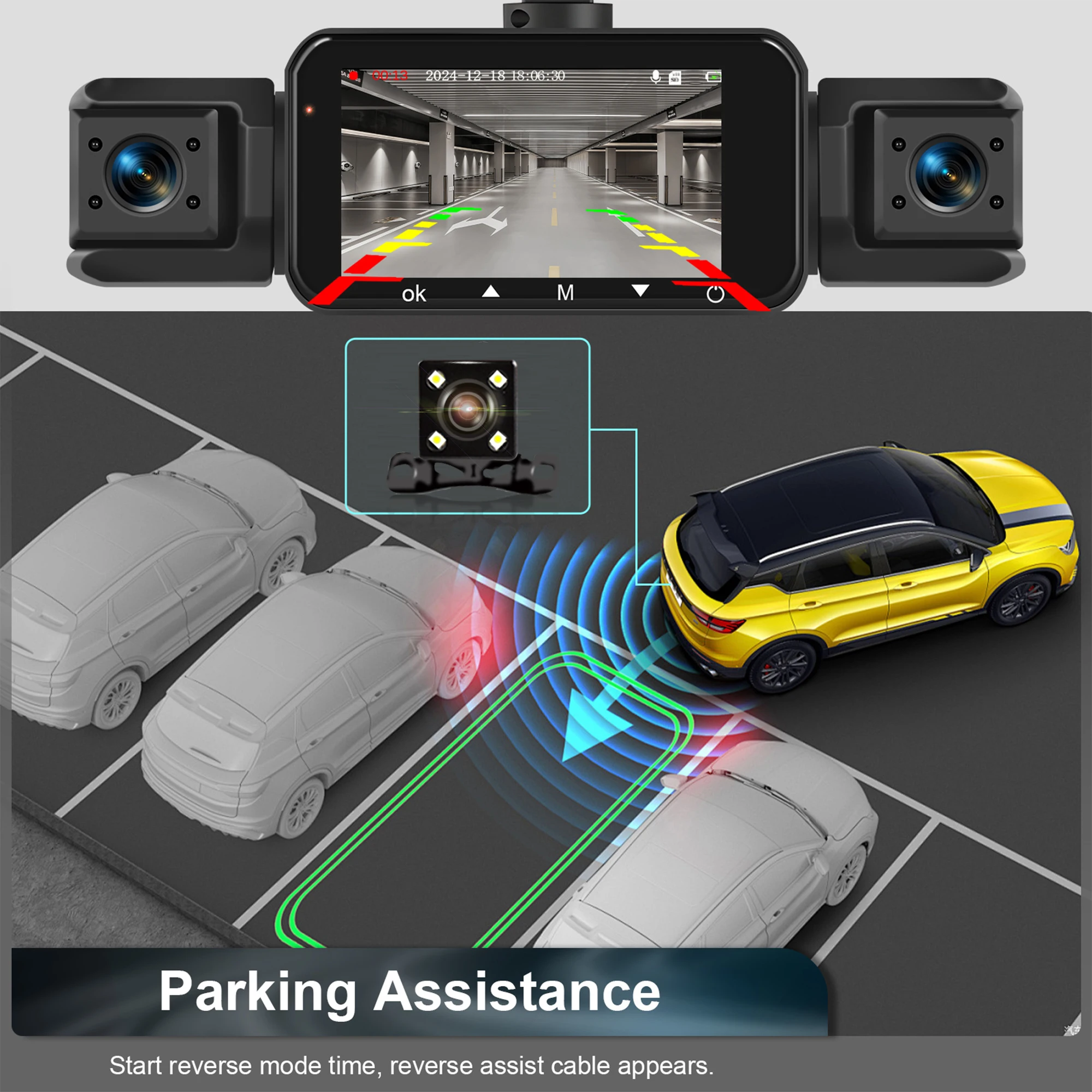 1080P FHD DVR camera is composed of a front lens, a left lens, a right lens, and an optional rear lens to cover as many as possible directions when you drive.