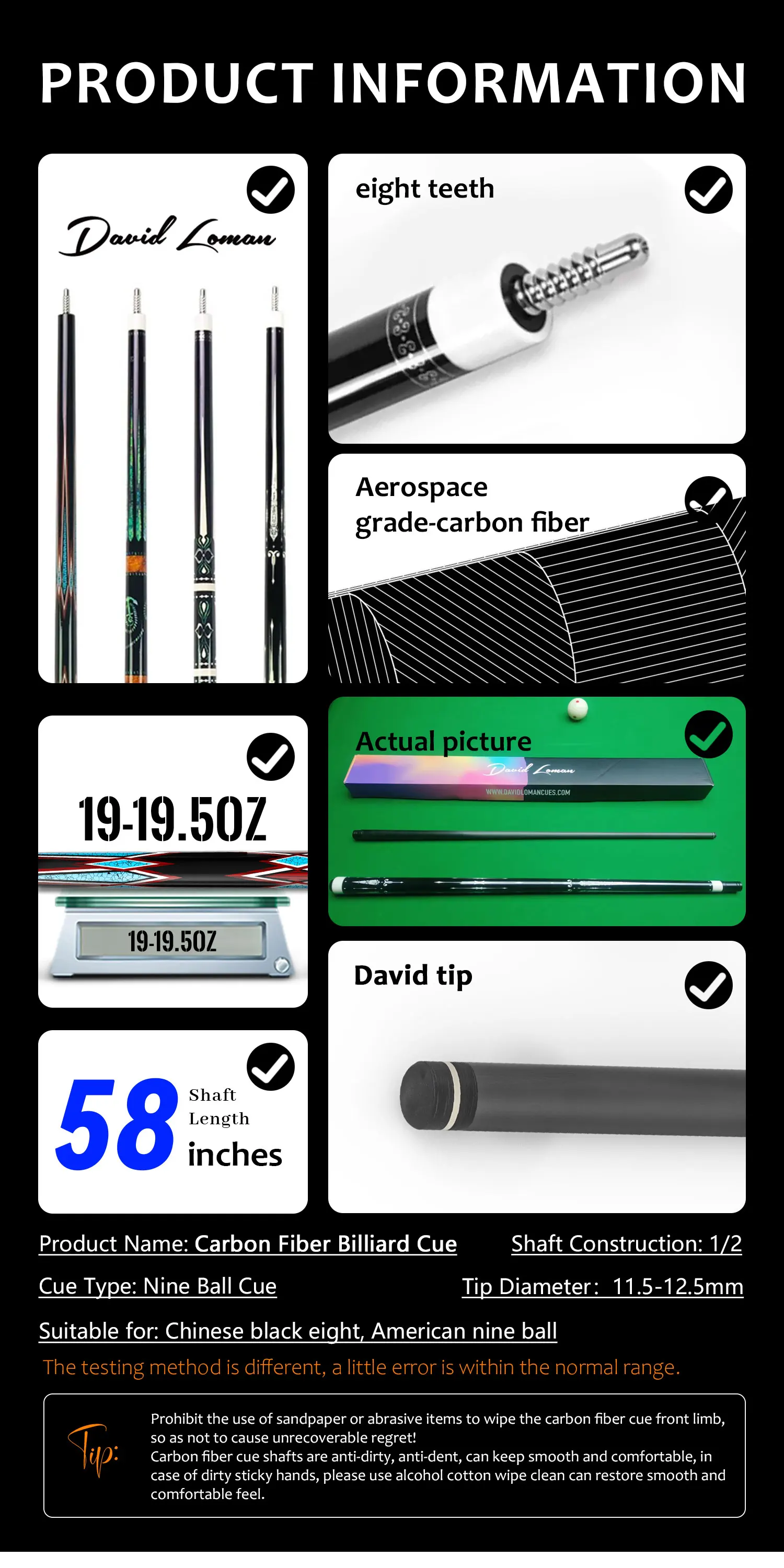 DAVID LOMAN Billiard Carbon Fiber Pool Cue Stick 58 inches,3/8 * 8-Pin Joint and 11.5mm/12.5mm Pen Tip,high qualit balliard play
