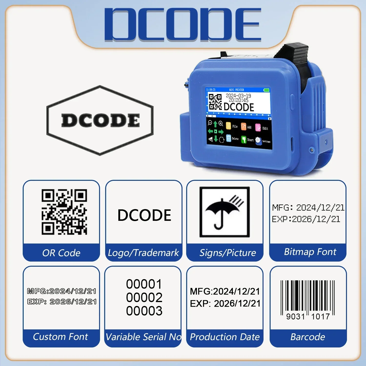 DCODE Blue XMINI 12.7mm Portable Mini Handheld Thermal Inkjet Printer Text QR Barcode Image Batch Number Logo Date Label Coder