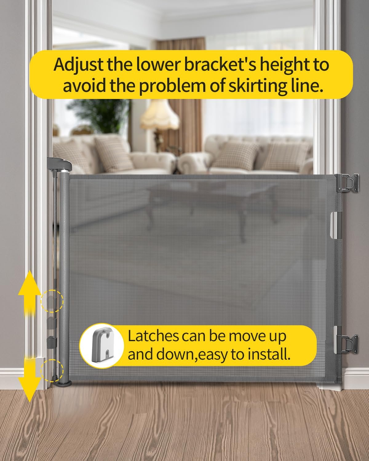 EASY INSTALLTION :Can be installed at top and bottom of stairways, doorways, hallways, indoor and outdoor use. includes components for easy installation.You will get: Retractable mesh gate x1, Bracket x2, Latches x2, Wall anchors x8, Screws x8, Instructions x1,using the tools provided, you can get a new and safe child gate installed in minutes.