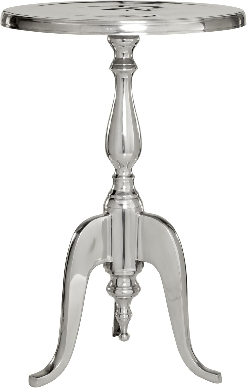 Bring a finishing touch to your home with an inviting appeal with this beautifully crafted accent table. A compact friendly table providing you with additional surface storage space any where in your home. Ideal for entryways or living areas, this silver end table can be adorned with books or topped with a glass vase of fresh flowers for an added touch of charm. This item ships in 1 carton. Suitable for indoor use only. Some assembly required. Maximum weight limit is 100 lbs. Made in India. This is a single silver colored end table. Traditional style.
