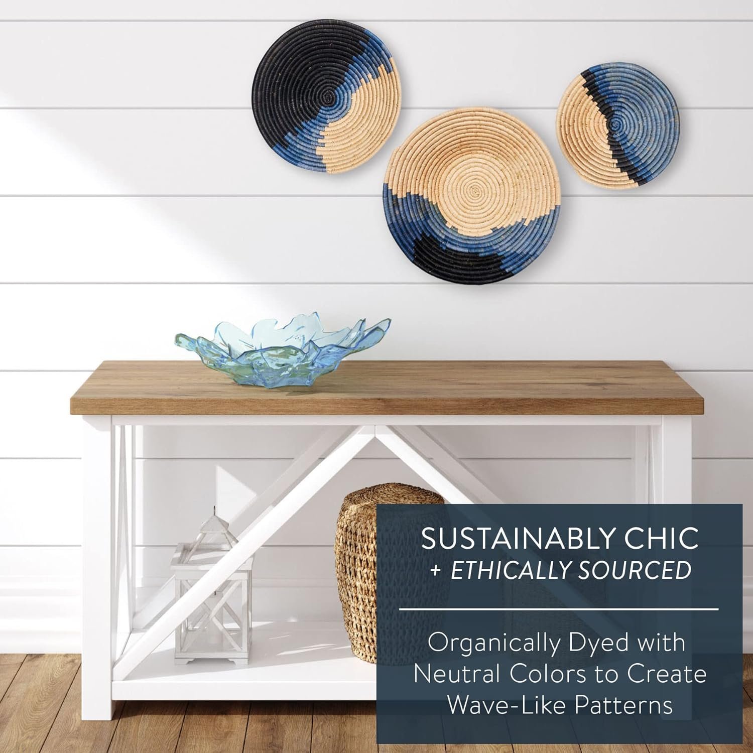 ETHICALLY SOURCED: Inspired by water and ocean shorelines, these containers are carefully woven with Raffia, and organically dyed with calming and neutral colors to create a rhythmic wave-like pattern. Each bowl includes 4 positioning loops so that you can customize the hanging position