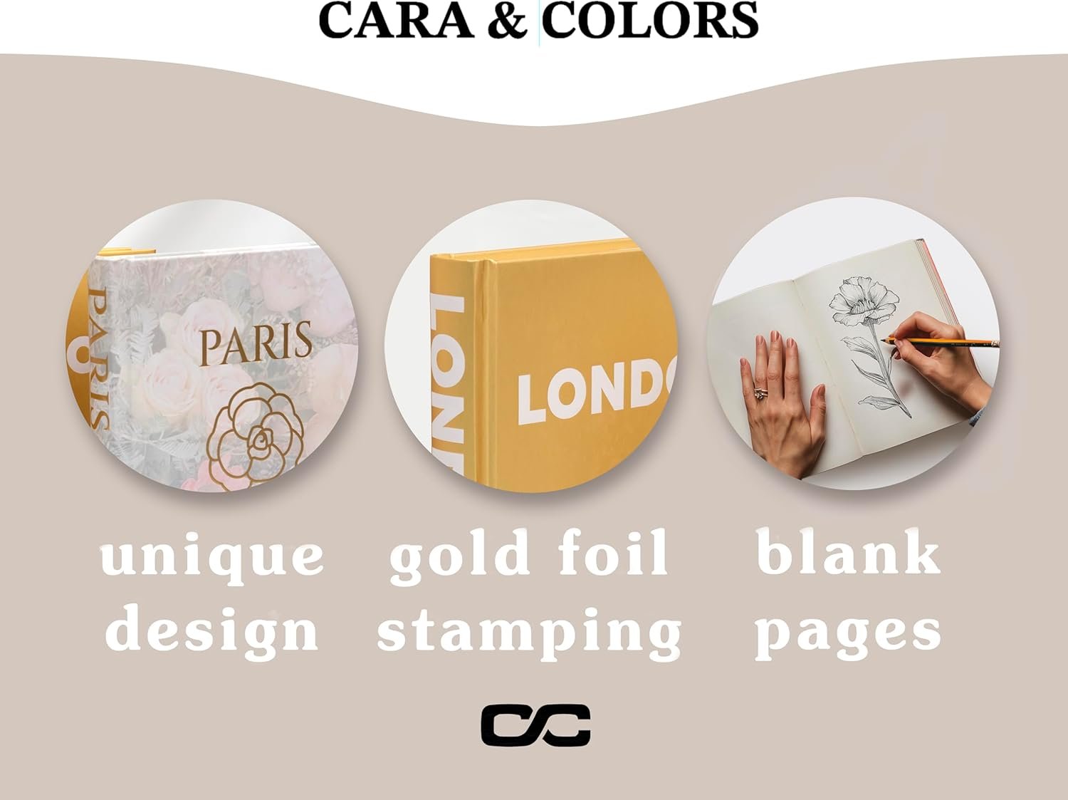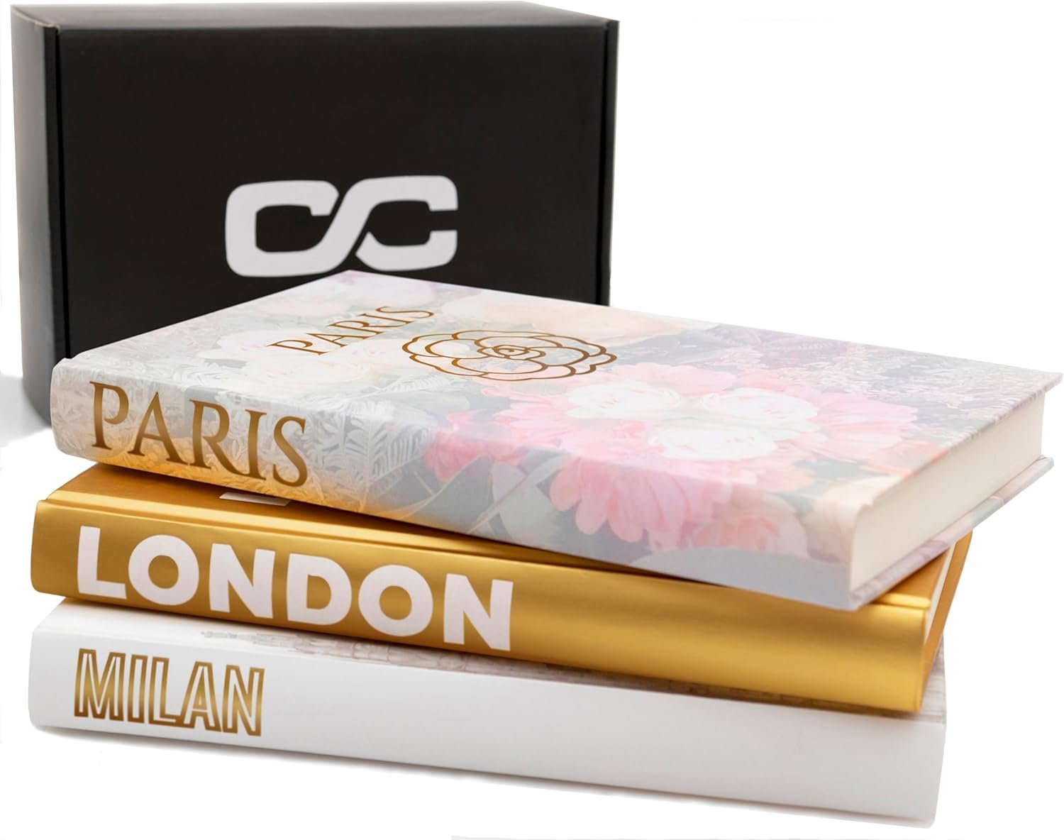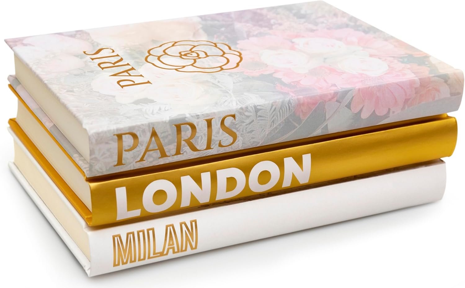 SET OF 3 BOOKS WITH BLANK PAGES — Hardcover books made of high-quality paper are titled with famous European fashion capitals for sophisticated home décor. Also use as journals, sketchbooks, photo albums, and scrapbooks. Approx. 5.8” x 8.5” x 1” each.