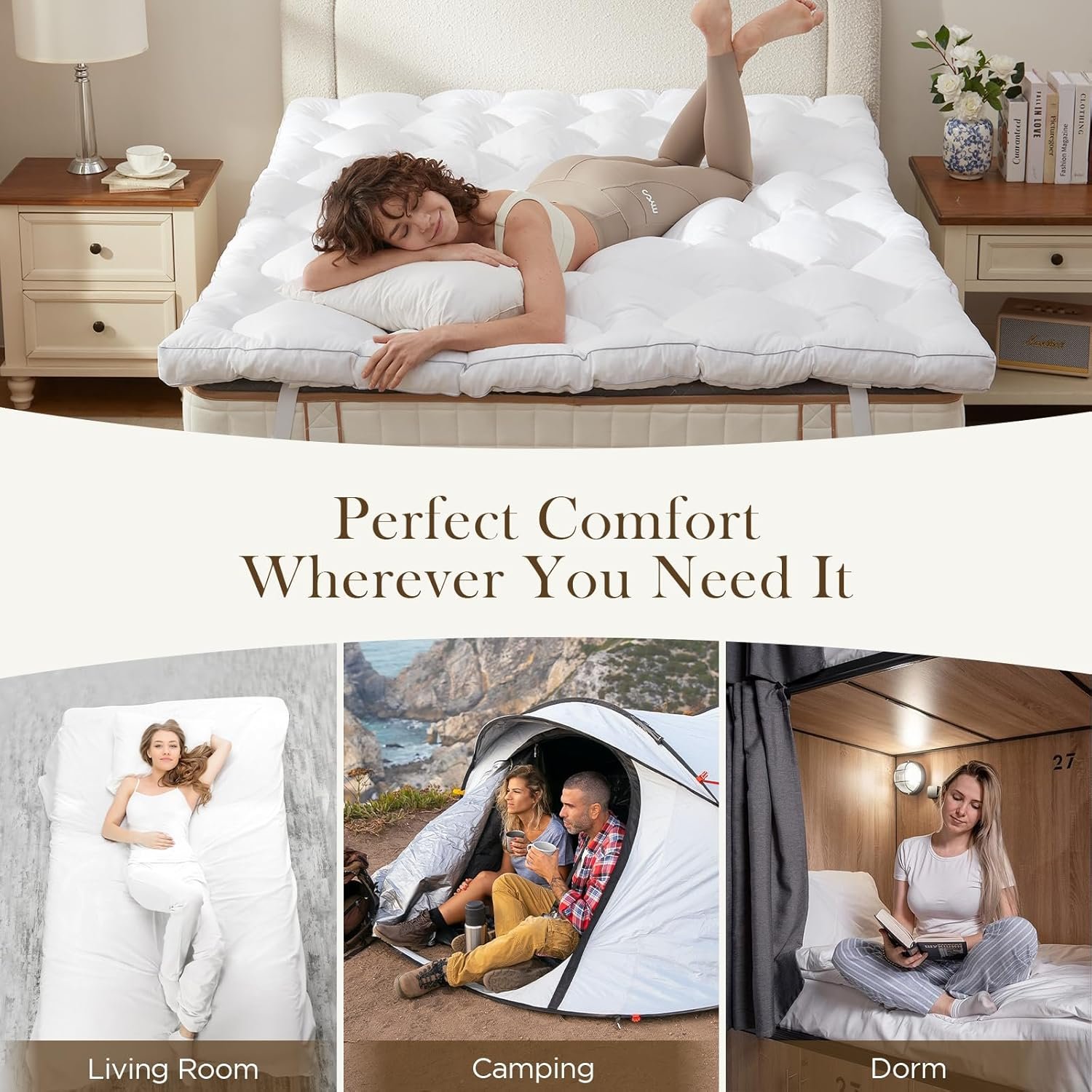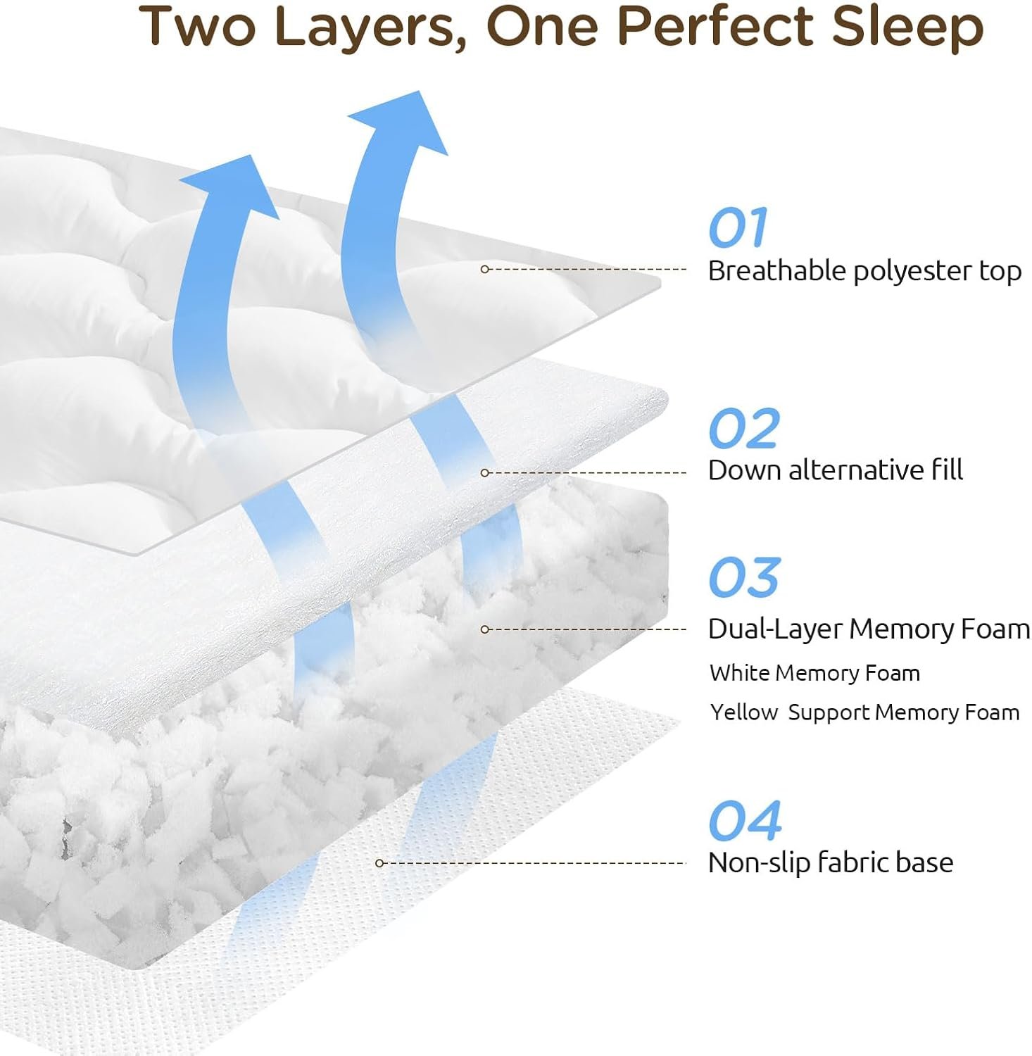 Anti-Slip Design – The non-slip backing ensures added stability, while 4 sturdy anchor straps keep the topper securely in place, allowing you to enjoy uninterrupted sleep without frequent adjustments.