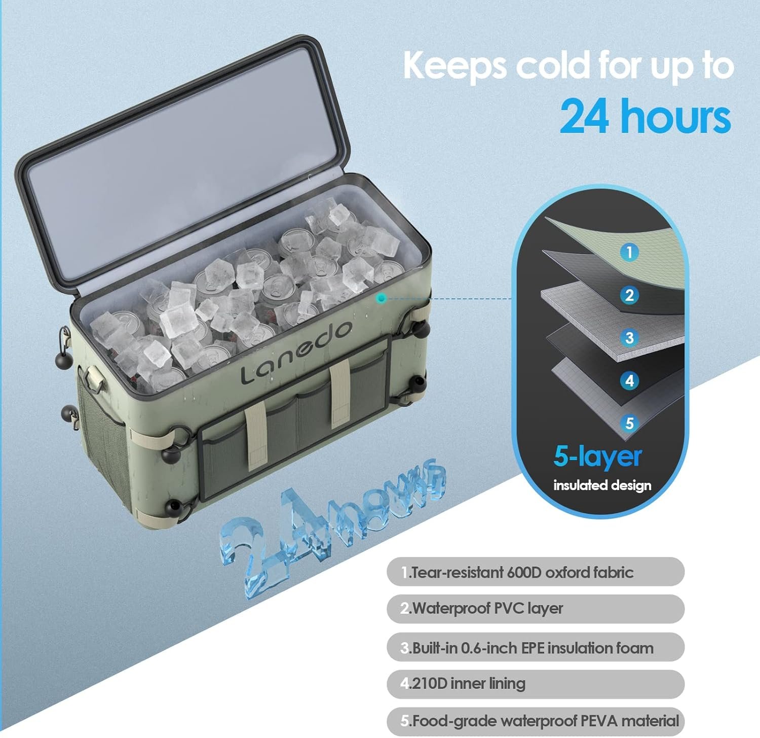 【𝐔𝐧𝐦𝐚𝐭𝐜𝐡𝐞𝐝 𝐈𝐜𝐞 𝐑𝐞𝐭𝐞𝐧𝐭𝐢𝐨𝐧】: The LANEDO Cooler is your ultimate companion for 𝗸𝗲𝗲𝗽𝗶𝗻𝗴 𝘆𝗼𝘂𝗿 𝗯𝗲𝘃𝗲𝗿𝗮𝗴𝗲𝘀 𝗶𝗰𝗲-𝗰𝗼𝗹𝗱 𝗳𝗼𝗿 𝗼𝘃𝗲𝗿 𝟮𝟰 𝗵𝗼𝘂𝗿𝘀, making it perfect for all-day outdoor adventures.