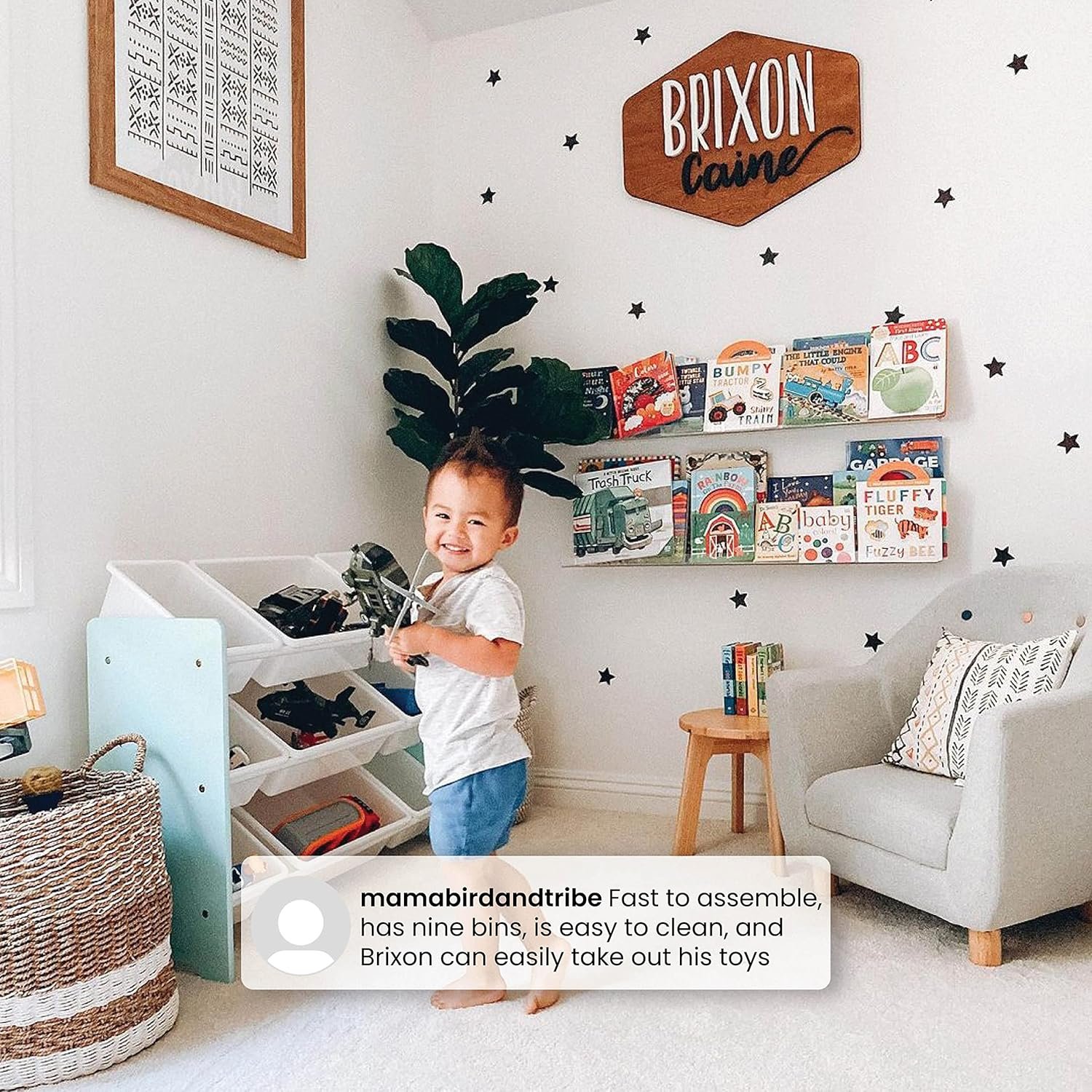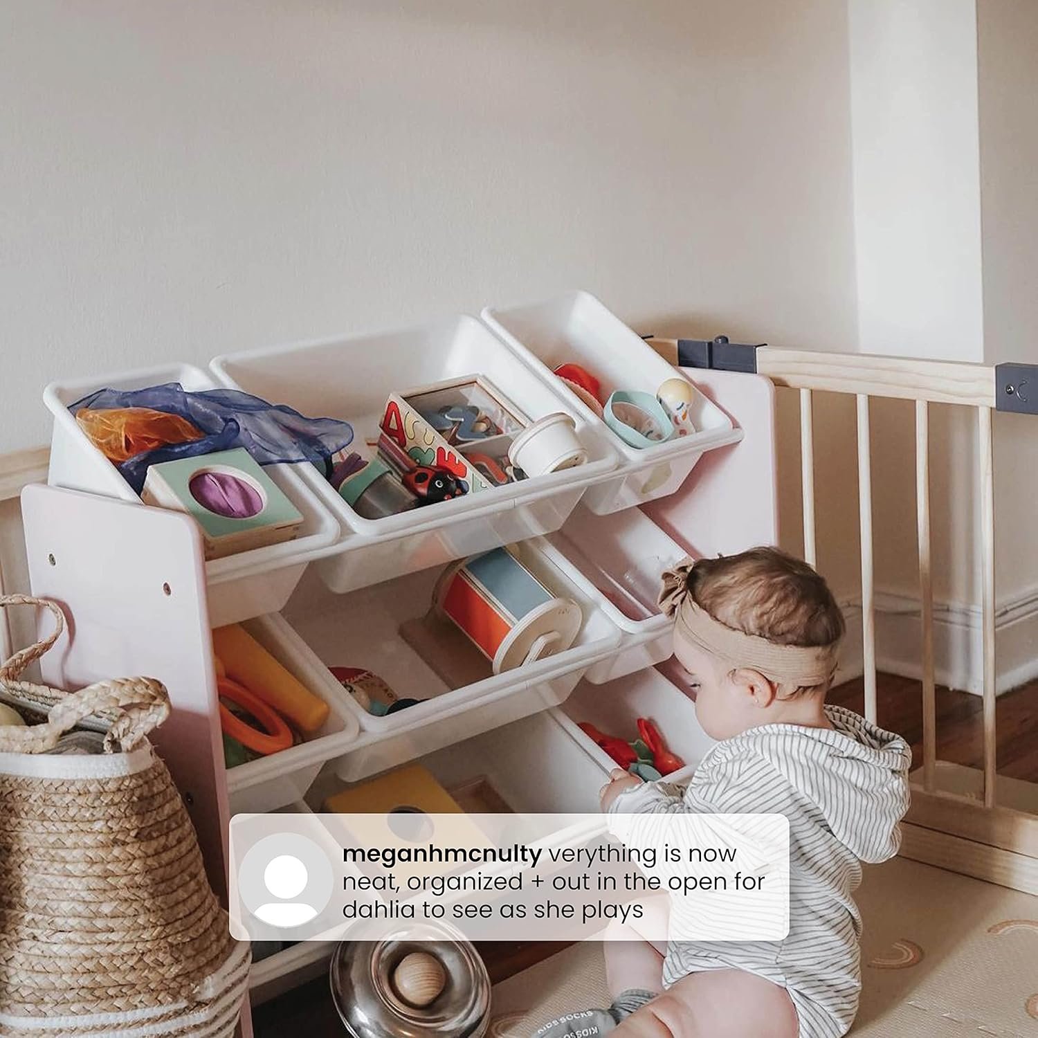 A PLACE FOR EVERYTHING: Nine (9) plastic bins in varying sizes easily stow books, toys, art supplies or books