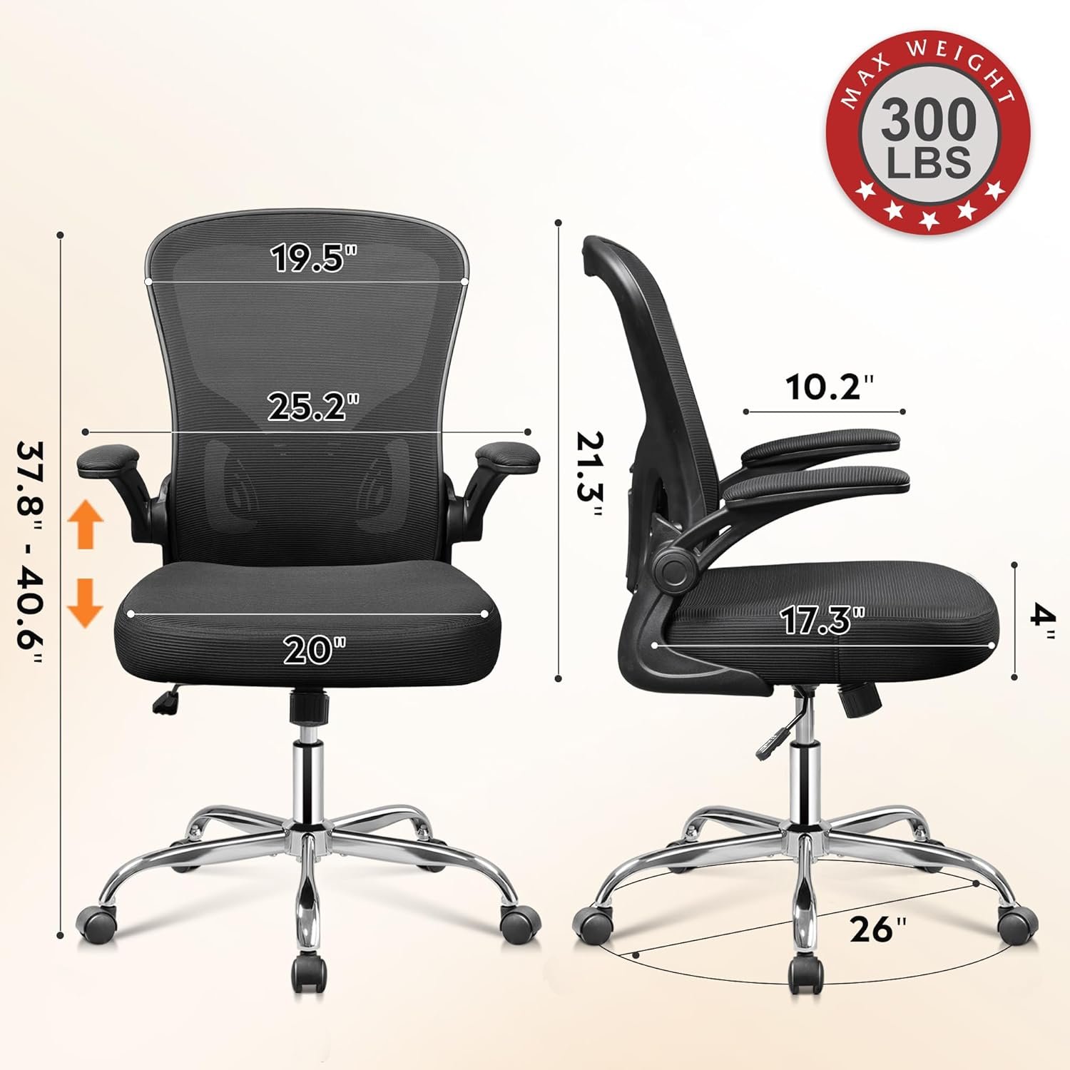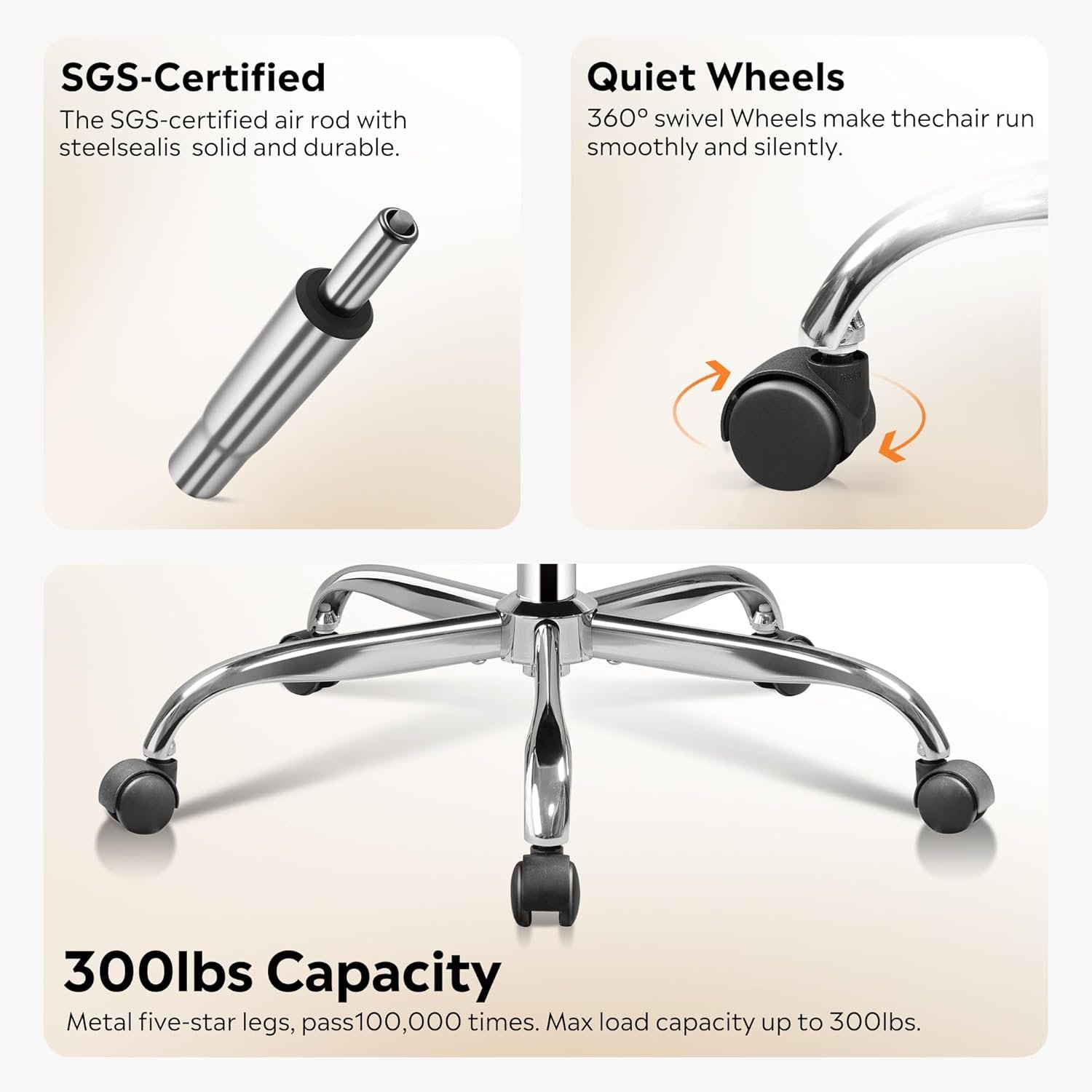 High-Quality Construction for Durability and Stability: Constructed with a sturdy iron base and durable casters, the chair supports up to 300 lbs. The BIFMA-tested casters provide smooth mobility across various surfaces, while the robust base ensures stability and long-term use, making it a reliable choice for both home and office settings.