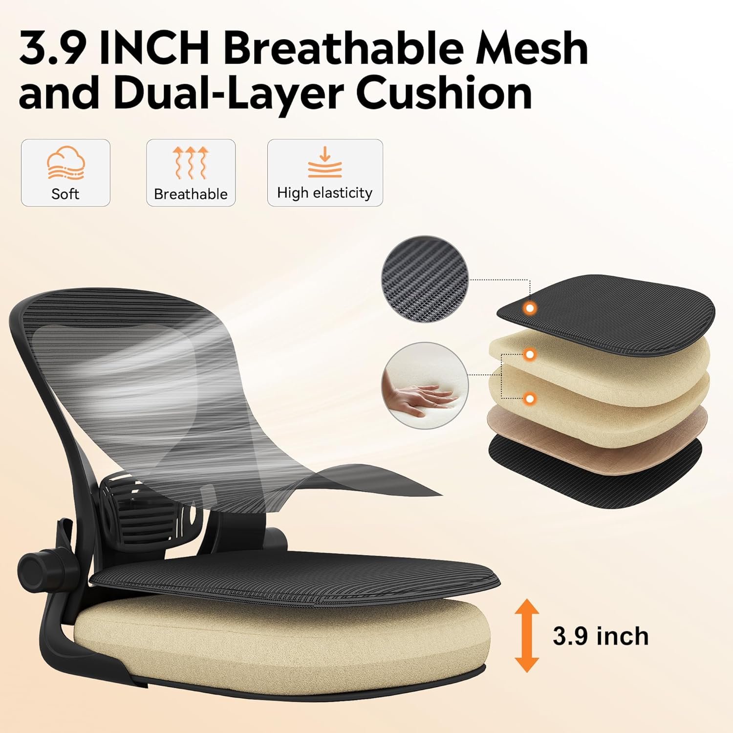 Breathable Mesh and Dual-Layer Cushion for Extended Comfort: The back and seat feature breathable mesh, providing excellent airflow to prevent heat buildup from prolonged sitting. The dual-layer high-density foam cushion (25D + 30D) combines softness with robust support, effectively reducing hip pressure and offering lasting comfort—perfect for both work and gaming sessions.