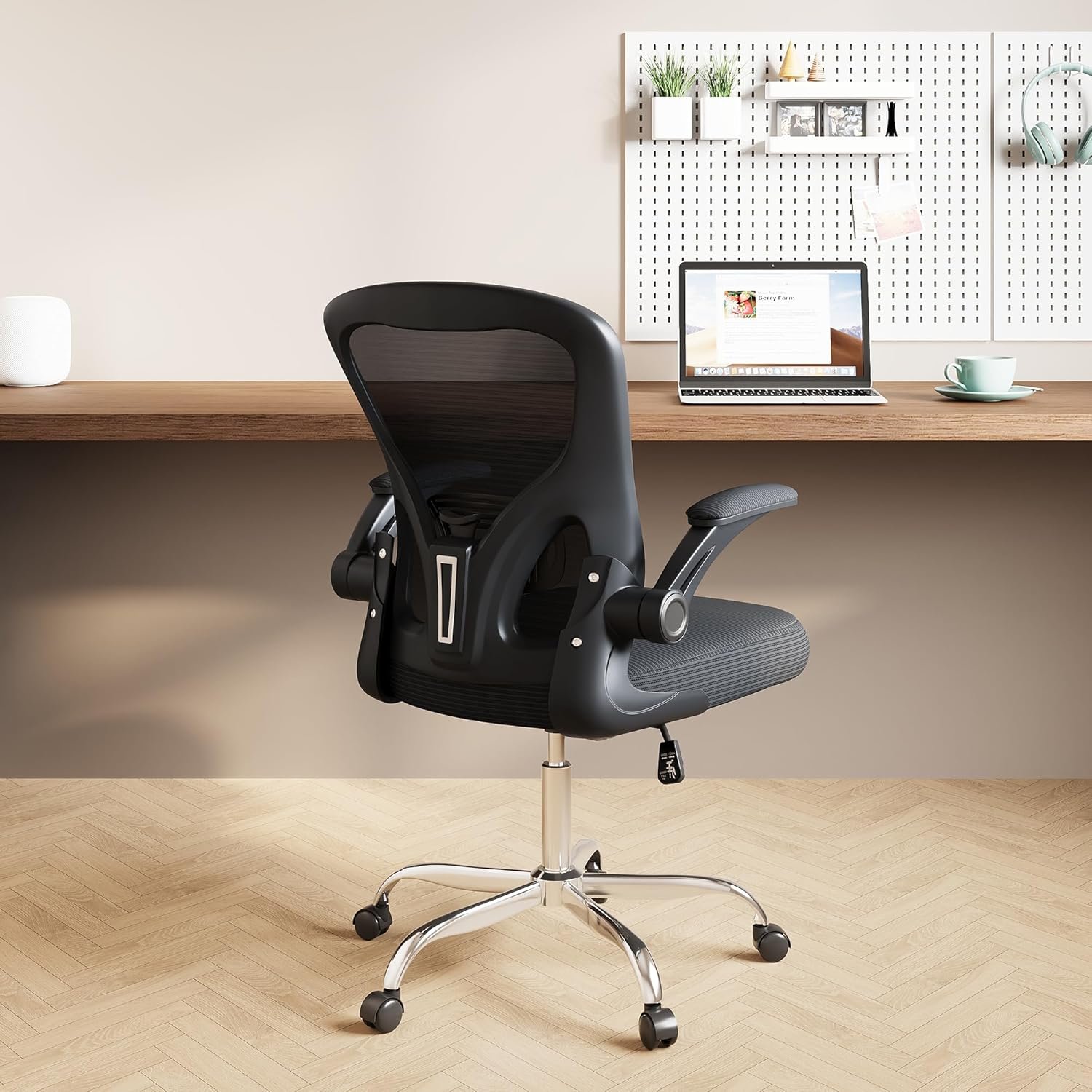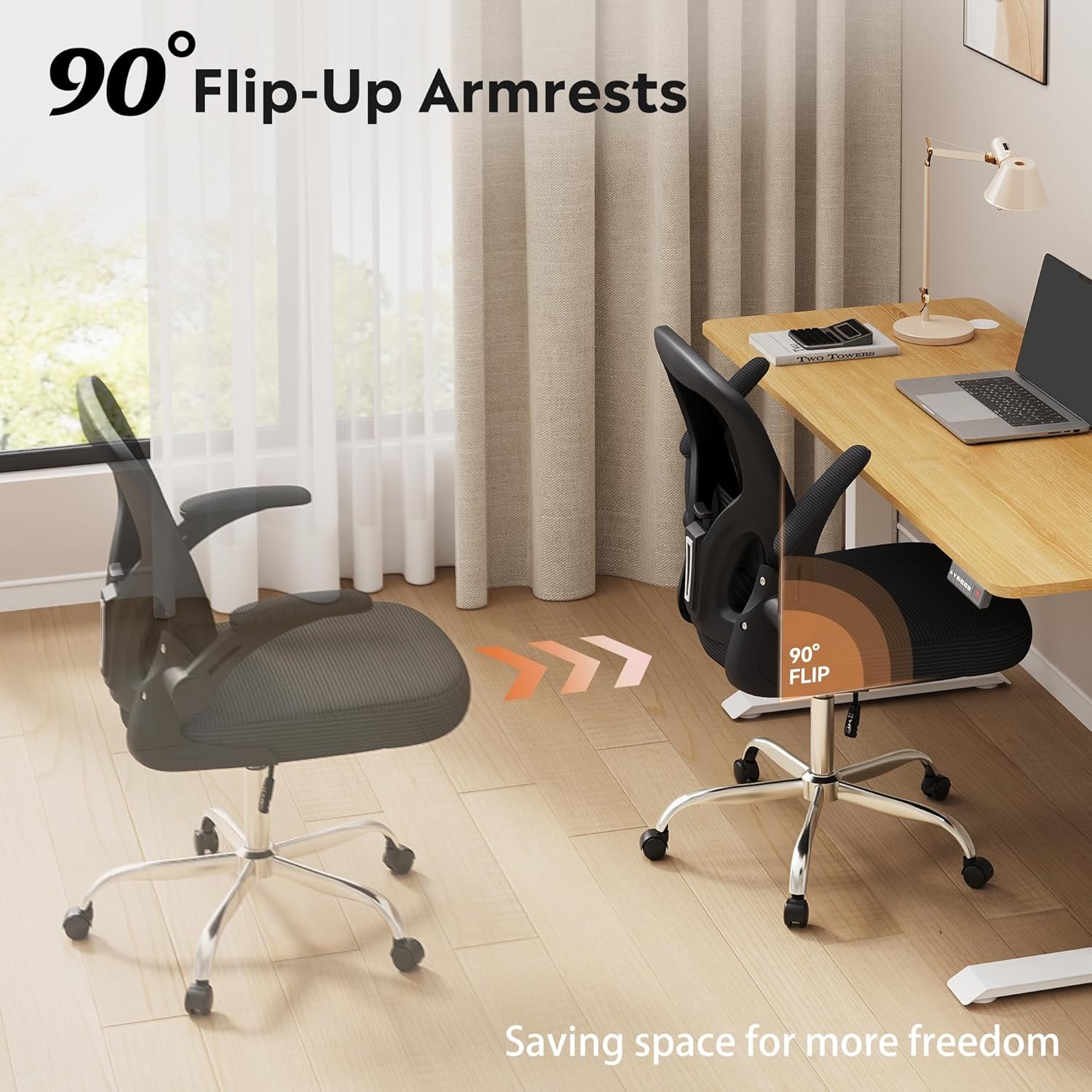 Space-Saving Flip-Up Armrests: The chair is equipped with flip-up armrests that can be raised to save space when not in use. This feature is ideal for maximizing room in tight spaces and ensures that the chair can fit neatly under a desk, enhancing flexibility and functionality in your workspace.