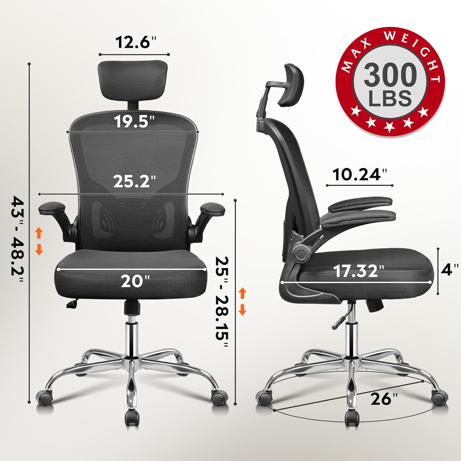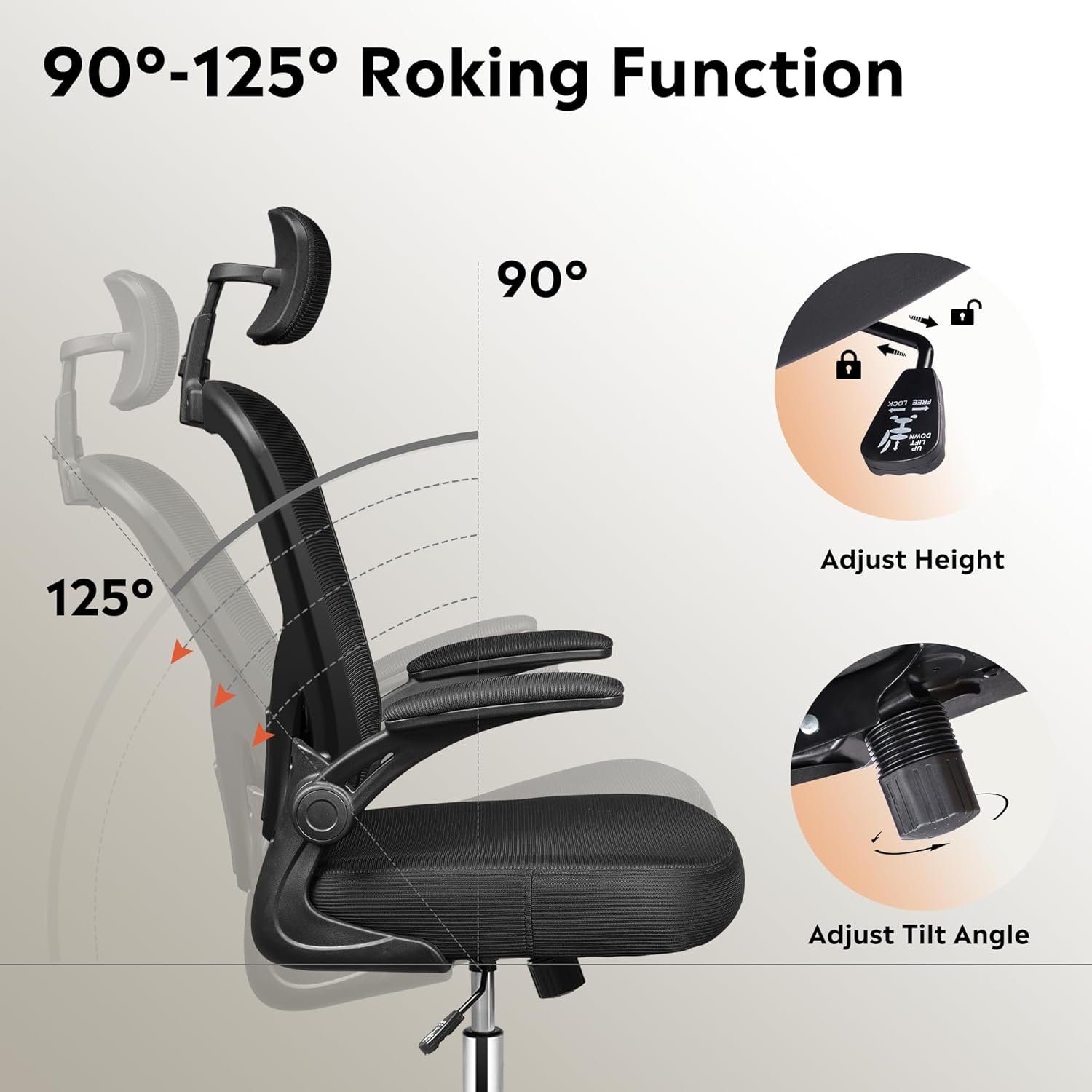 DEVAISE Office Chair High Back Mesh Ergonomic Desk Chair with Flip-up Armrests, Adjustable Headrest and Lumbar Support, Black