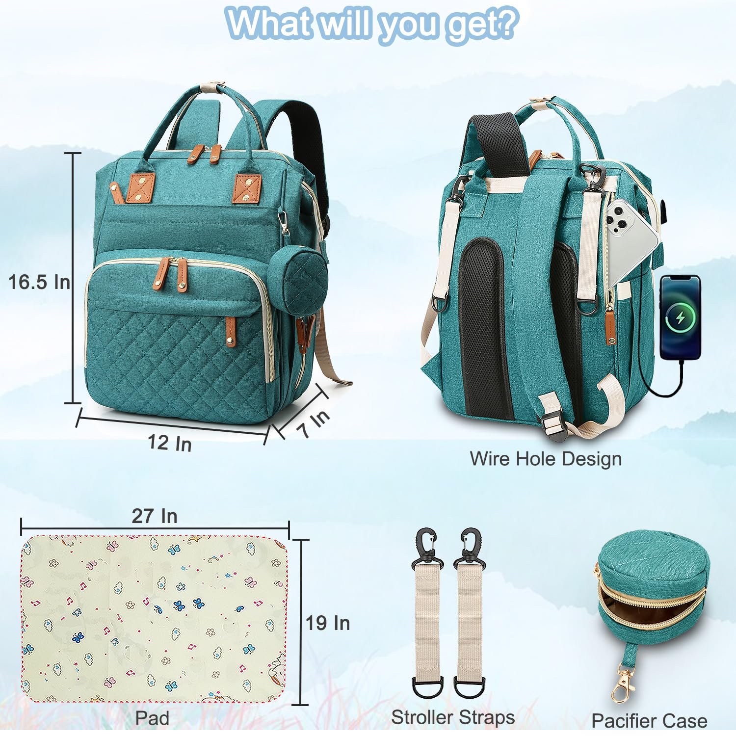 You’ll Get:A fashion diaper bag backpack ( size: 16” x 6” x 12”, weight: 1.9 lb), a pad (size: 27” x 19”), 2 stroller straps and a pacifier case. 16 pockets include double zipper closure compartment and 3 insulated pockets. This baby bag is lightweight, large capacity, and looks still compact. It is convenient and makes you relax if you use it to go out.