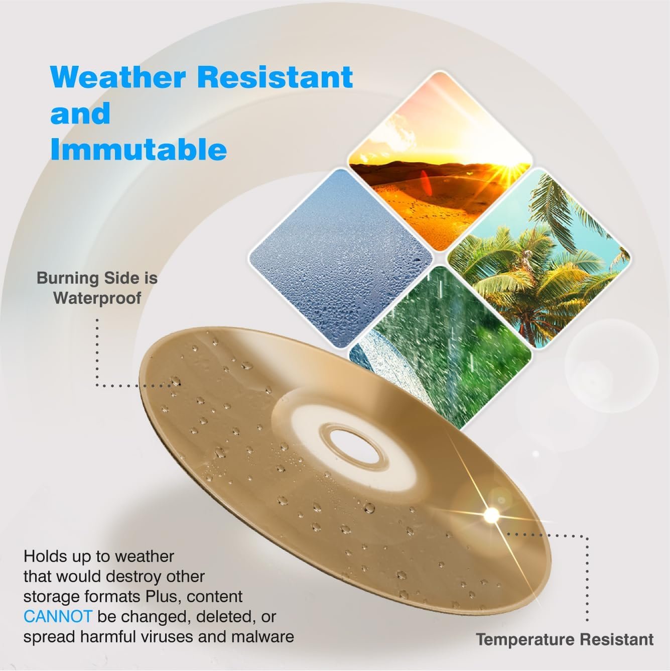 [Weather Resistant] These are resistant to weather and climate that could destroy other storage formats, like water and UV light. These BDXL 128GB discs can withstand UV sunlight that would destroy standard DVD discs as well as being water resistant that would destroy your typical hard drives and tapes.