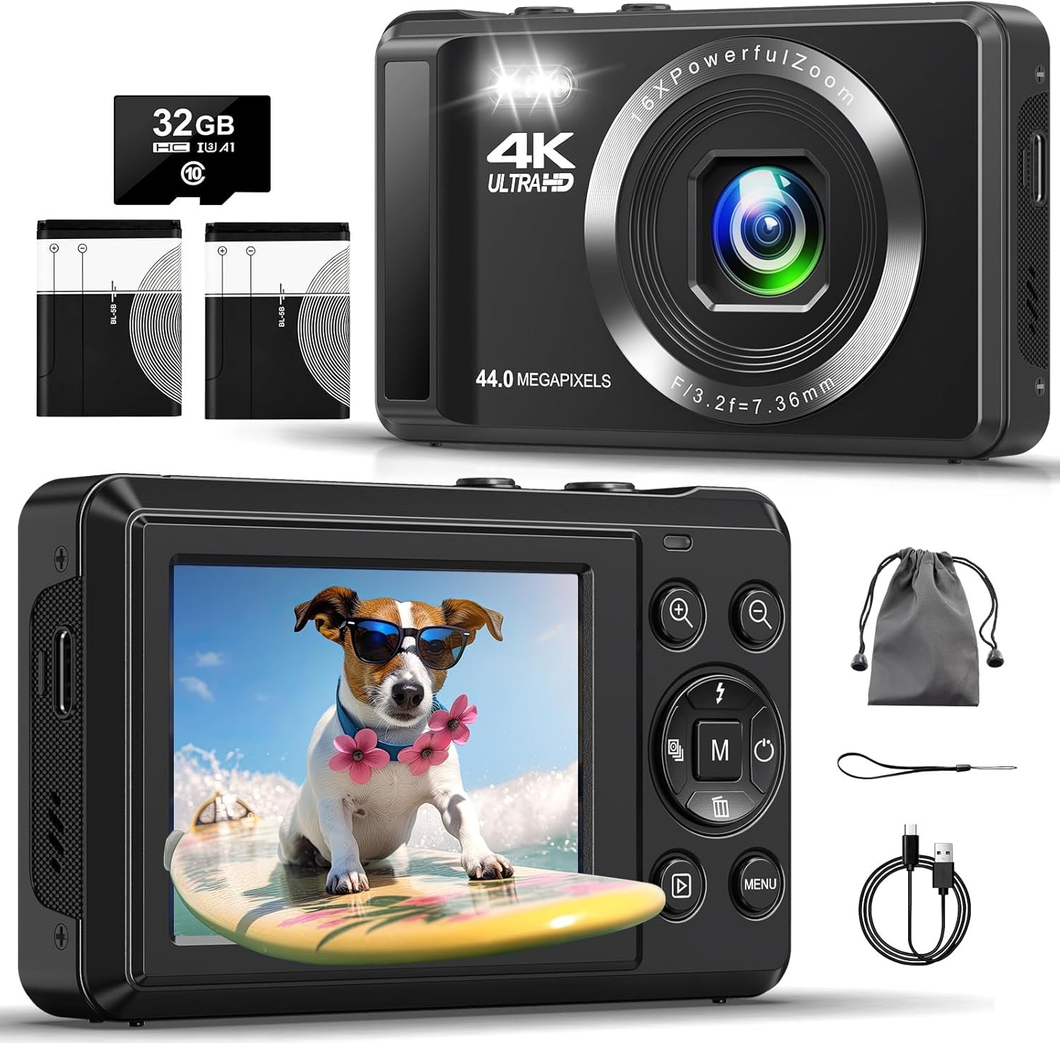 Digital Camera – 4K 44MP UHD Digital Cameras for Photography – Autofocus Point and Shoot Vlogging Camera with 16X Zoom, 32GB SD Card, 2 Batteries – Compact Small Cameras for Kids Teens Boys Girls