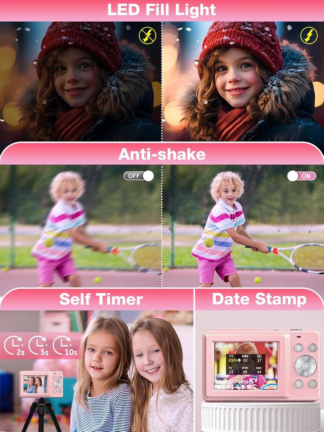 Digital Camera,FHD 1080P Kids Camera 44MP Point and Shoot Digital Cameras with 32GB Card,16X Zoom,Anti-Shake,Date Stamp,Compact Small Cameras Photography for Kids Student Teen Girl Boy(Pink)