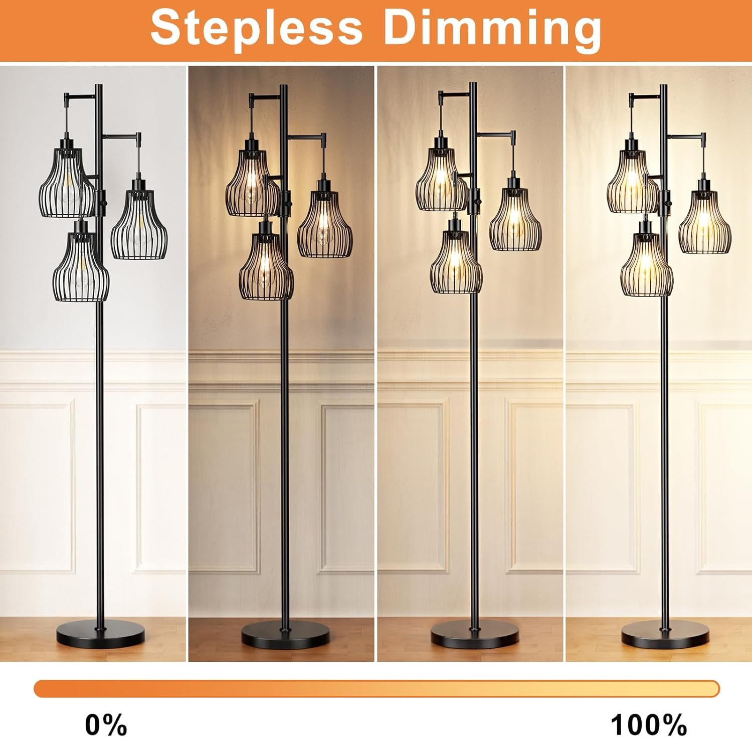 The dimming feature is better than expected as tall floor lamp has certain settings. And you will love the pattern the cage makes on the walls.